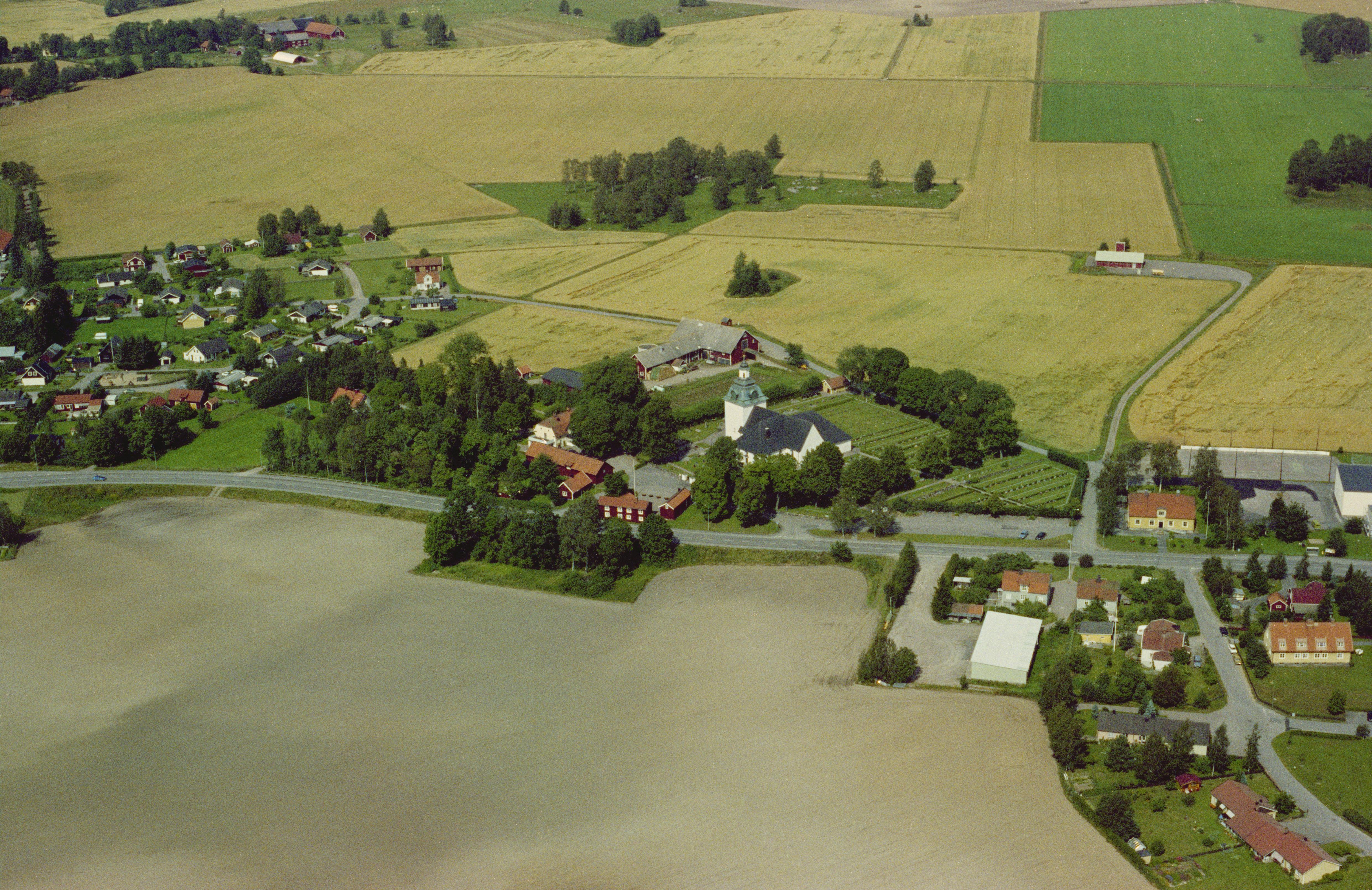 Beskrivning: Tjällmo tätort och kyrkby. Tjällmo kyrka till höger om bildens mitt. Bilden är tagen mot (väderstreck): N