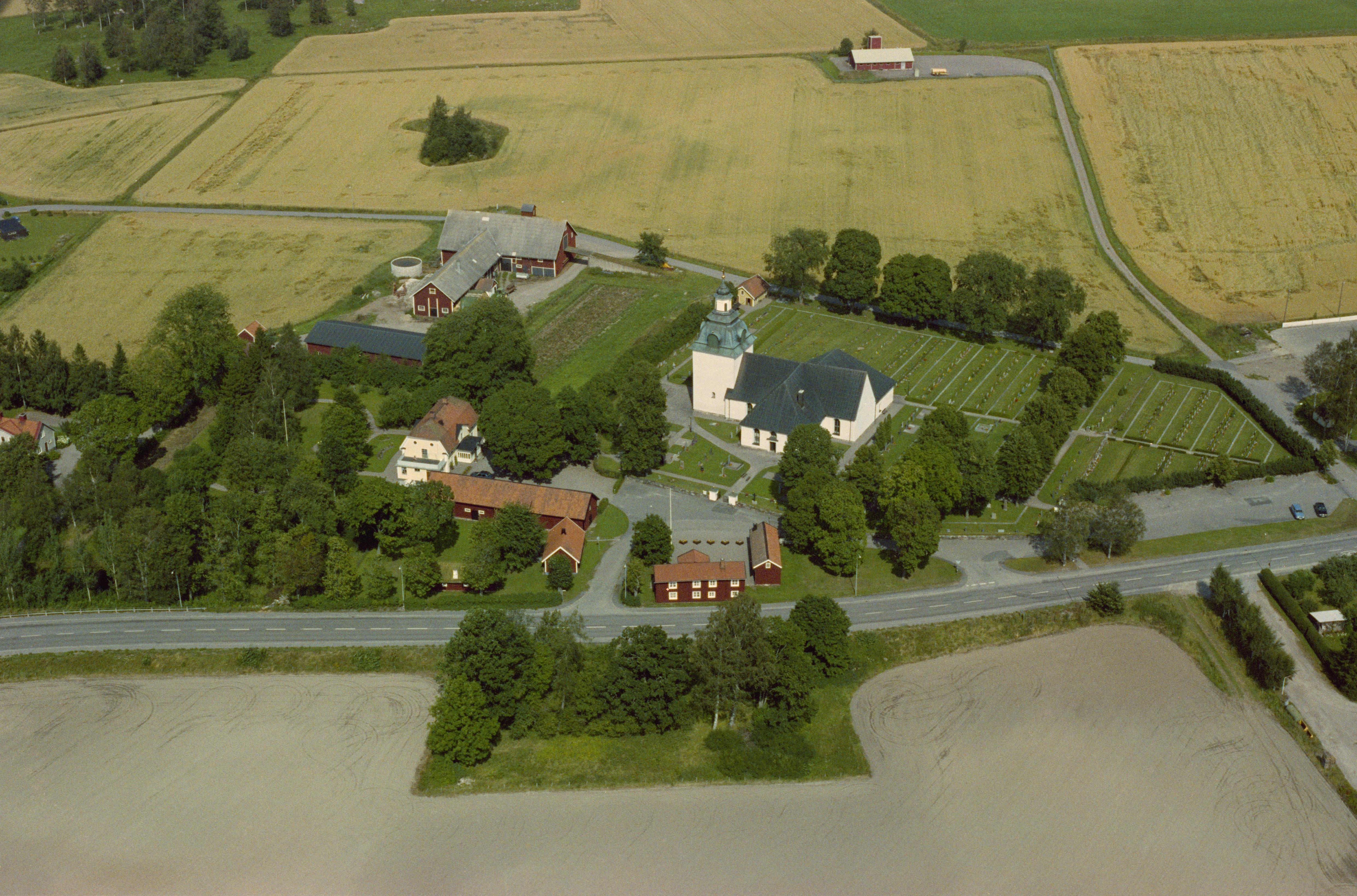 Beskrivning: Tjällmo tätort och kyrkby. Tjällmo kyrka i bildens mitt. Bilden är tagen mot (väderstreck): N