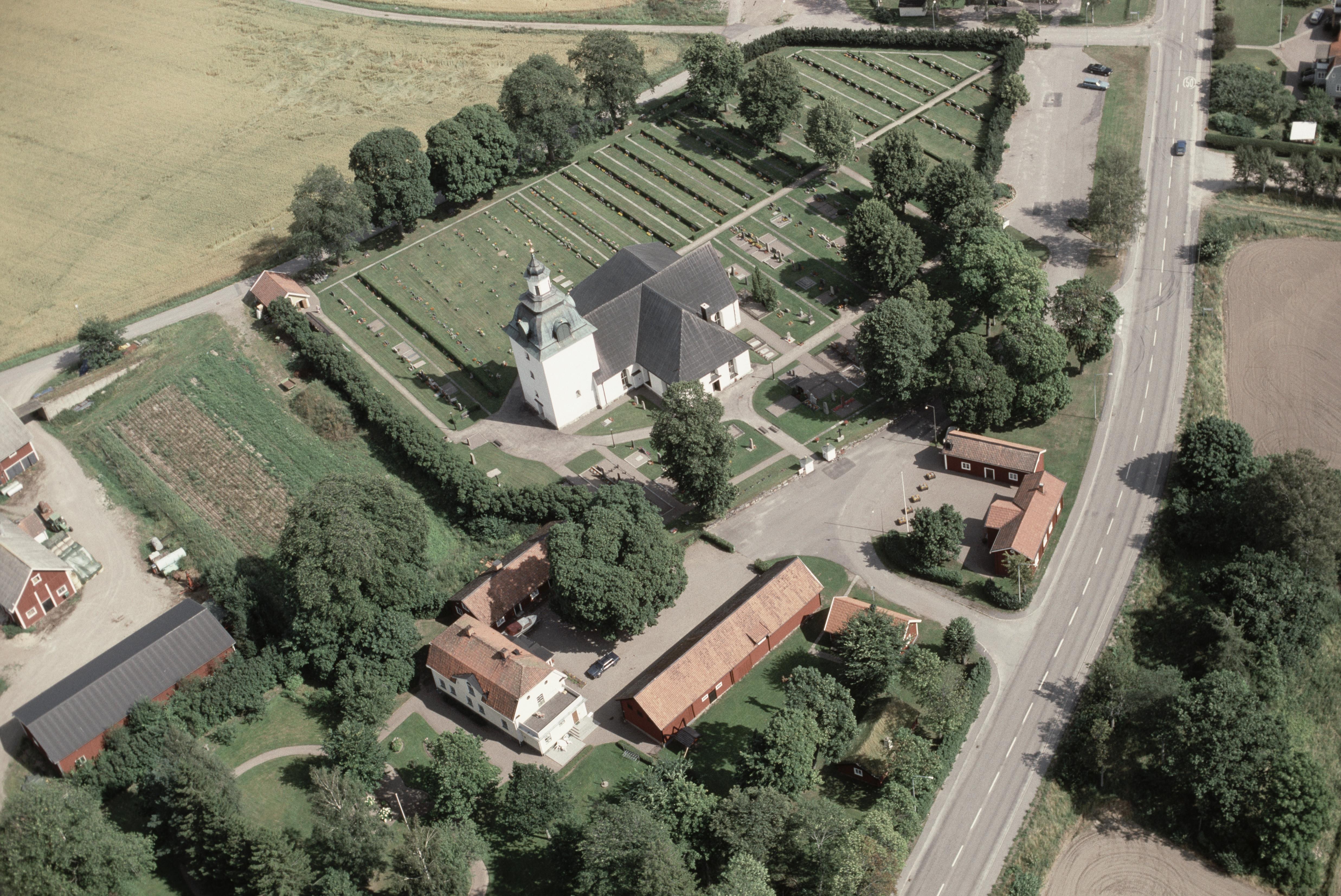Beskrivning: Tjällmo tätort och kyrkby. Tjällmo kyrka i bildens mitt. Bilden är tagen mot (väderstreck): NO