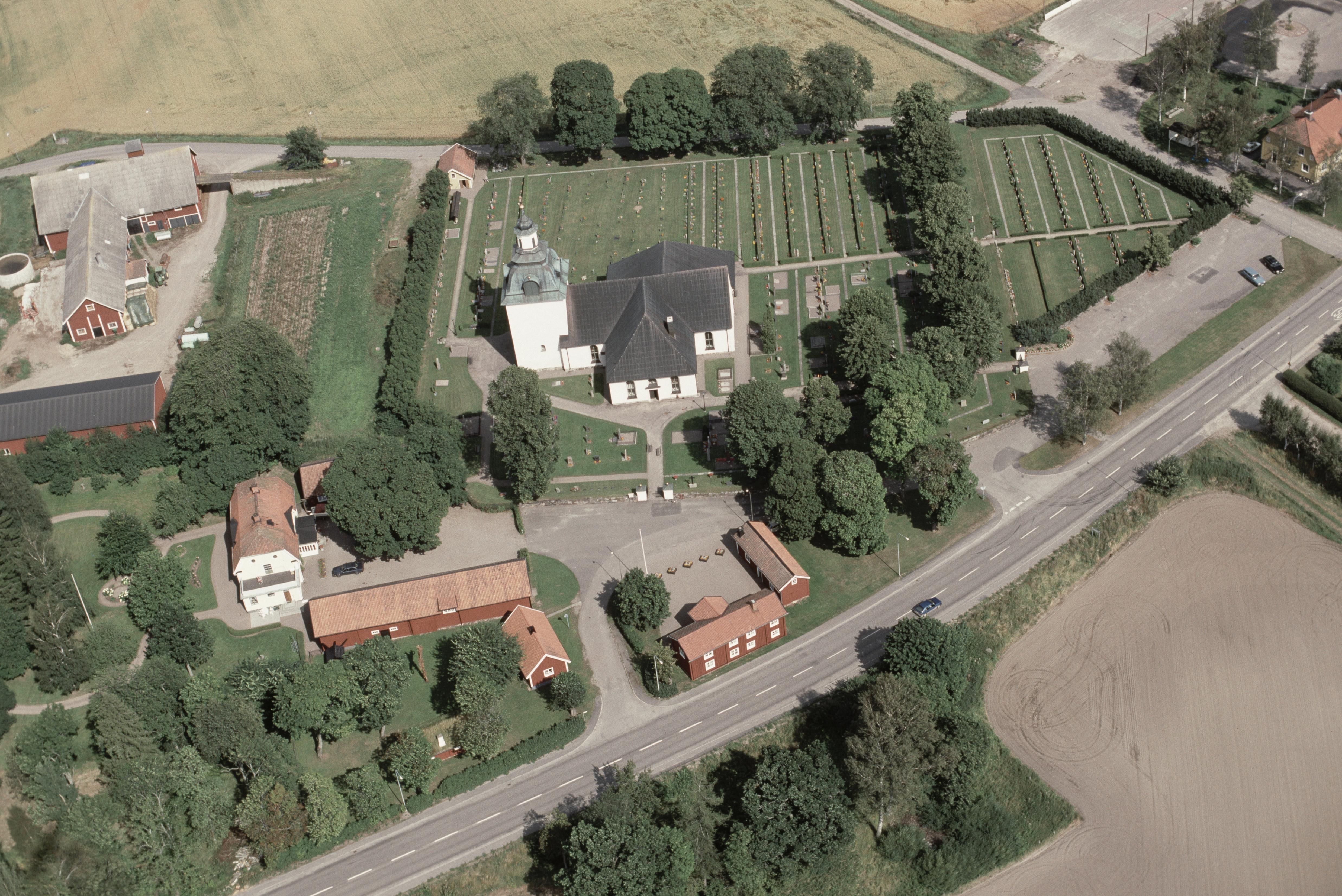 Beskrivning: Tjällmo tätort och kyrkby. Tjällmo kyrka vid bildens mitt. Bilden är tagen mot (väderstreck): NNO