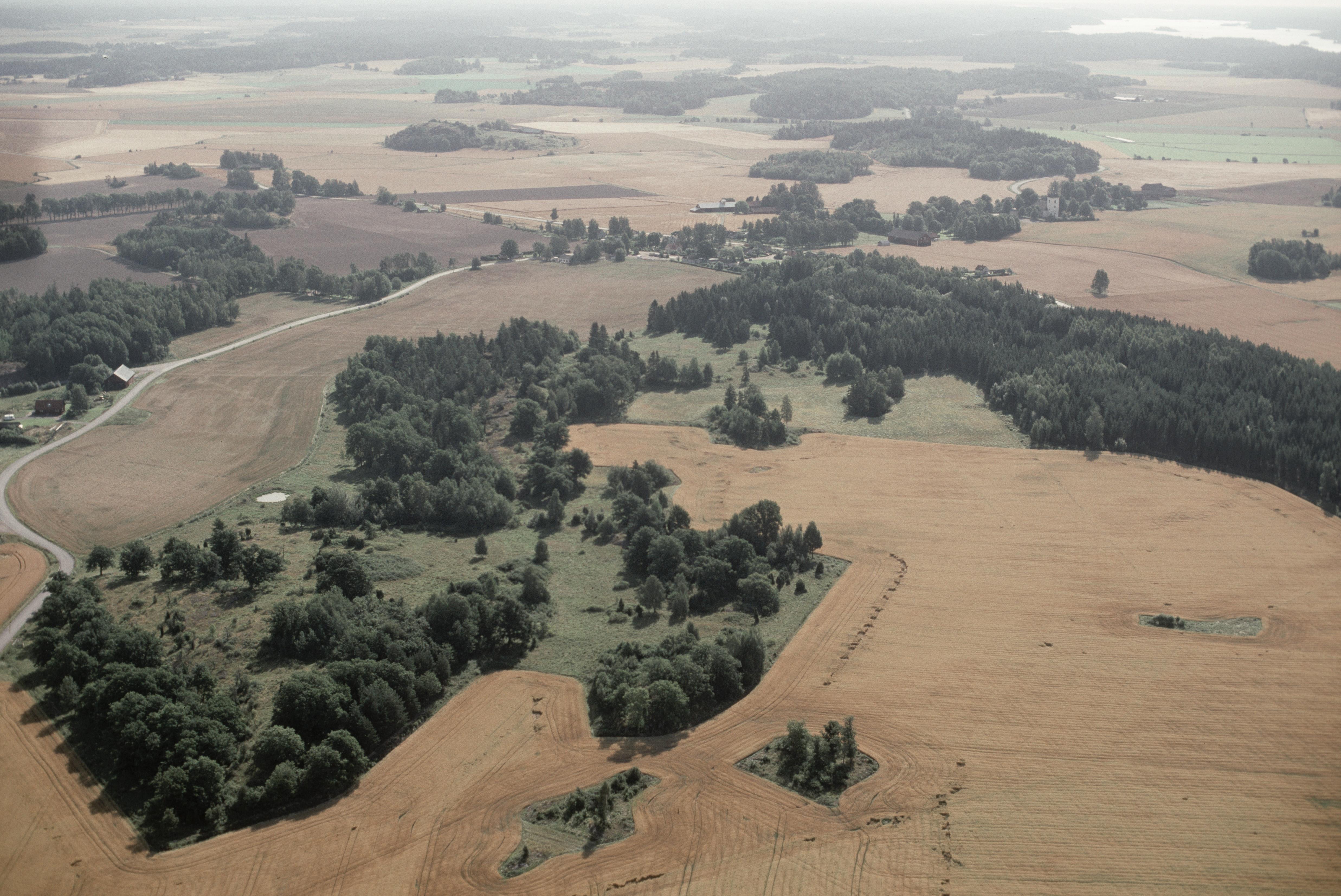 Beskrivning: Skjorstad öster om Almstads herrgård. Vid bildens mitt husgrund RAÄnr Tåby 6:1-2, gravfält Tåby 97:1, hällristning Tåby 93:1 m.fl. I bildens övre del Tåby kyrka och kyrkby. Bilden är tagen mot (väderstreck): ONO