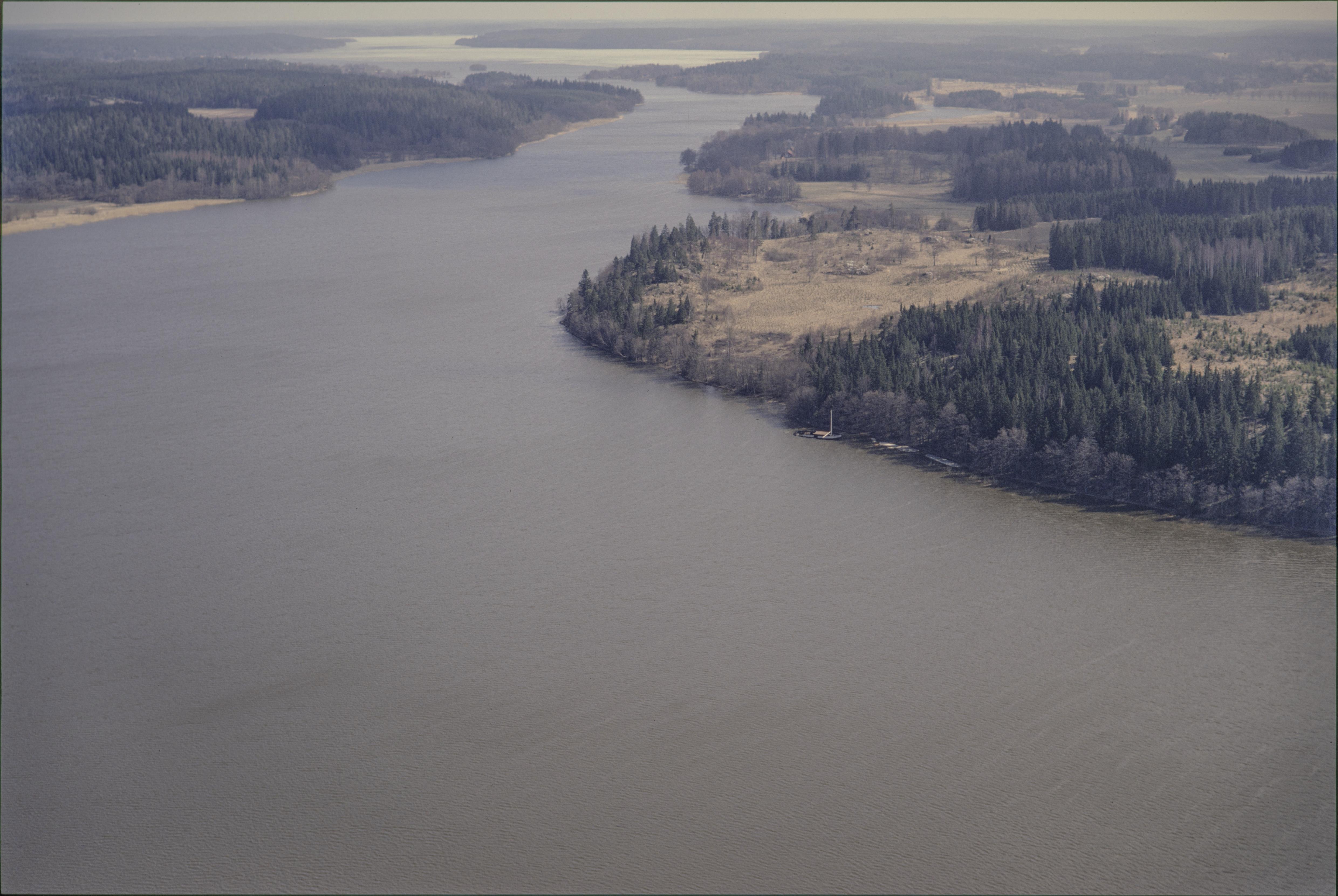 Beskrivning: Håtunaviken i Mälaren. Viken markerar gränsen mellan socknen Håtuna och Sankt Per (till vänster). Till höger om bildens mitt gravfält RAÄnr Håtuna 54:1 vid Håtunaholms herrgård. I bildens övre del Signhildsberg. Bilden är tagen mot (väderstreck): SO