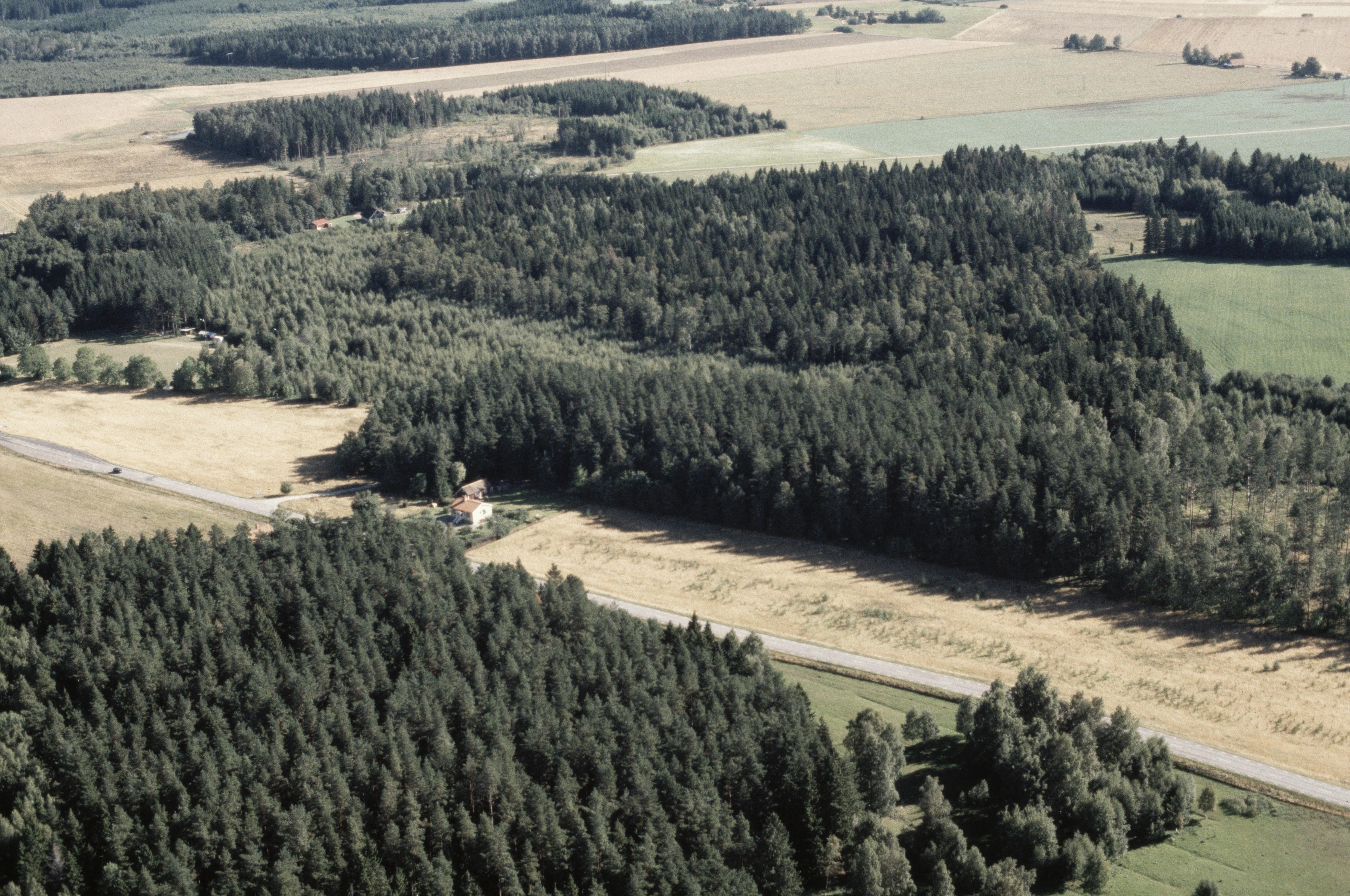 Beskrivning: Brännmästartorpet i Örnsnäs, vid gränsen mot Vallerstads socken (i bildens övre del). Fossil åker RAÄnr Allhelgona 76 och 77 vid bildens mitt. Bilden är tagen mot (väderstreck): Ö