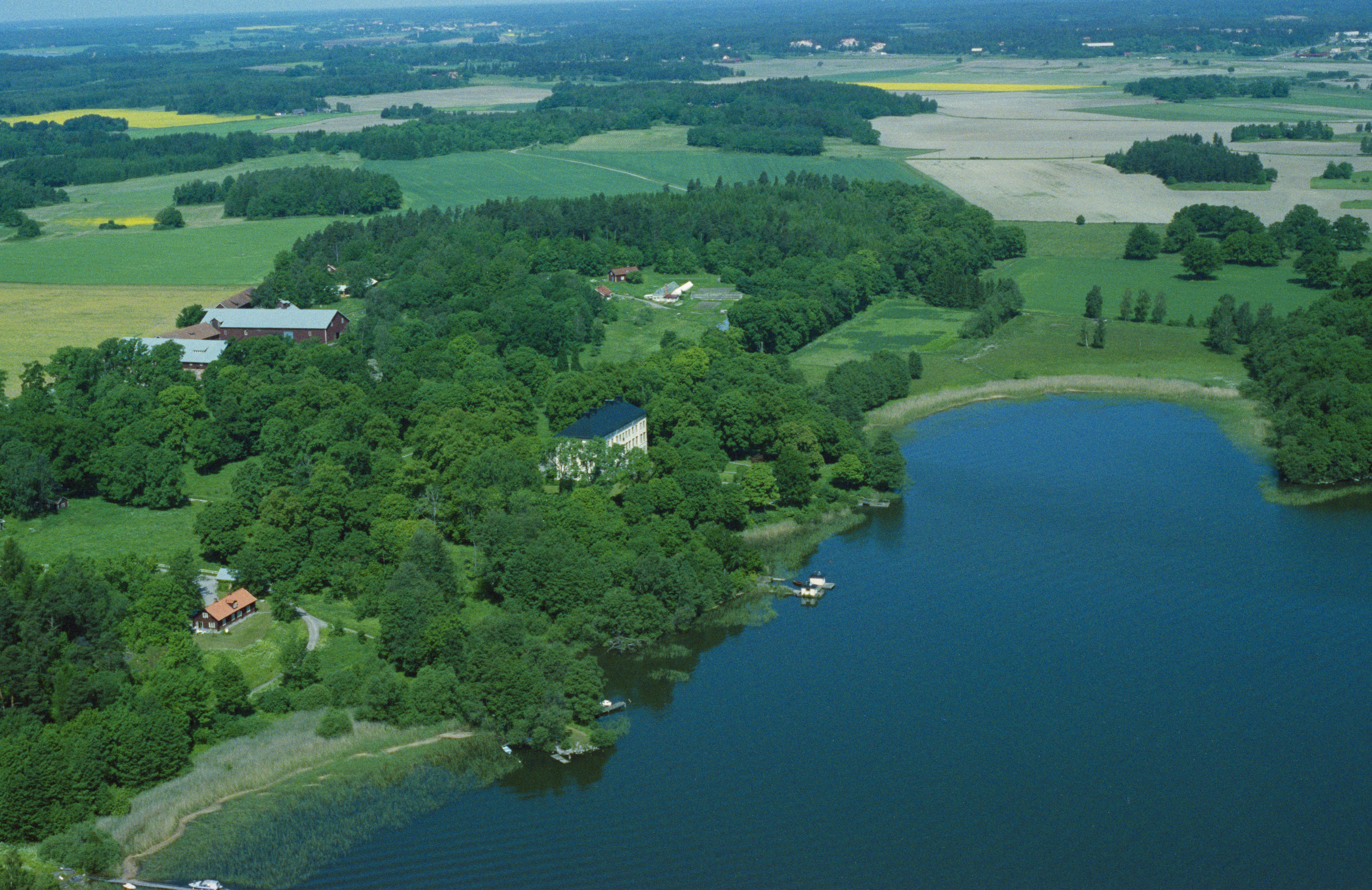 Beskrivning: Lennartsnäs herrgård vid fjärden Görväln i Östra Mälaren. Vid stranden minnesmärke RAÄnr Kungsängen 76:1-3. Bilden är tagen mot (väderstreck): NV
