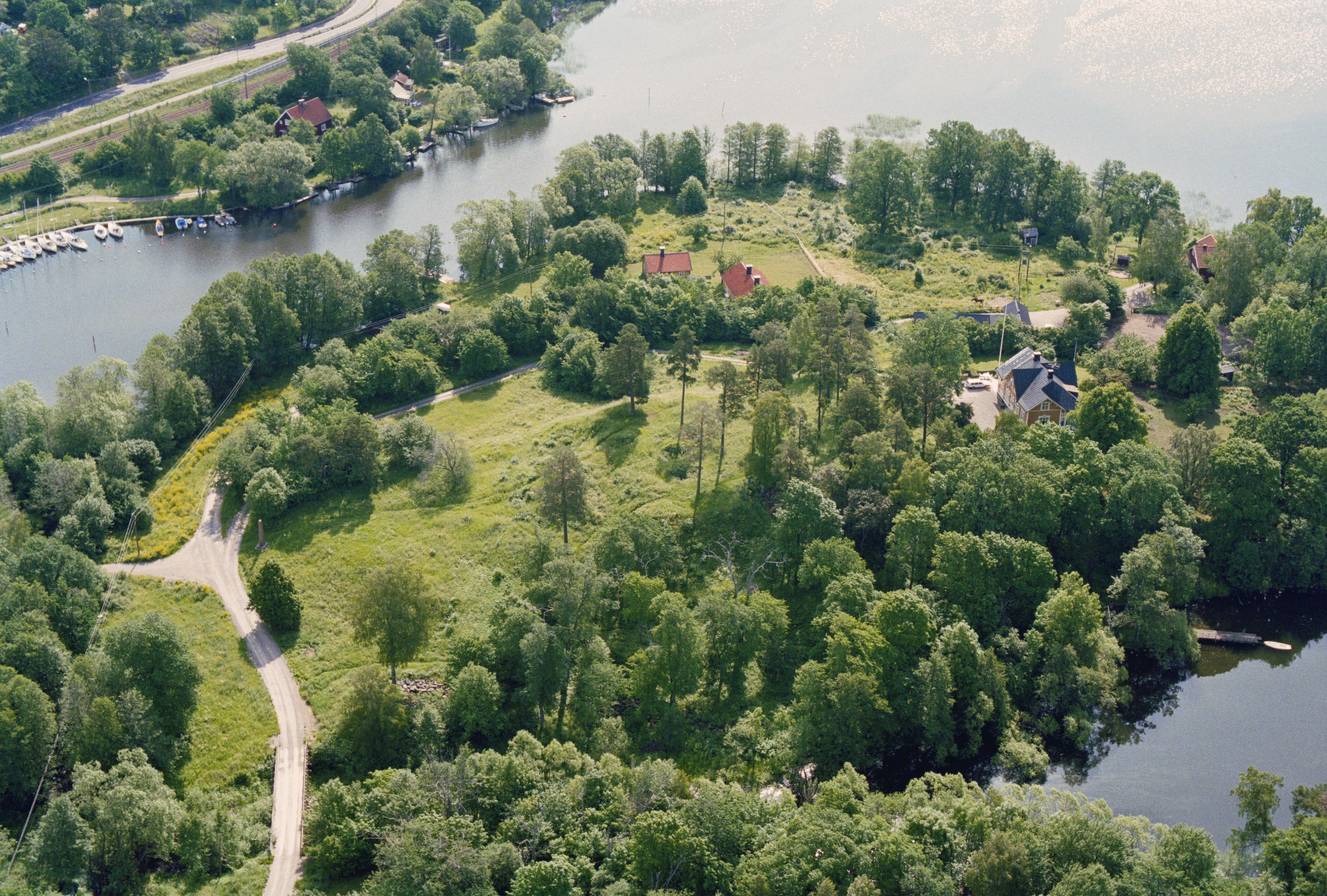 Beskrivning: Görväln i Mälaren. Stäketsholmen med borgruin Sankt Eriks borg RAÄnr Kungsängen 73:1. Tätorten Stäket i Järfälla socken uppe till vänster. Bilden är tagen mot (väderstreck): SO