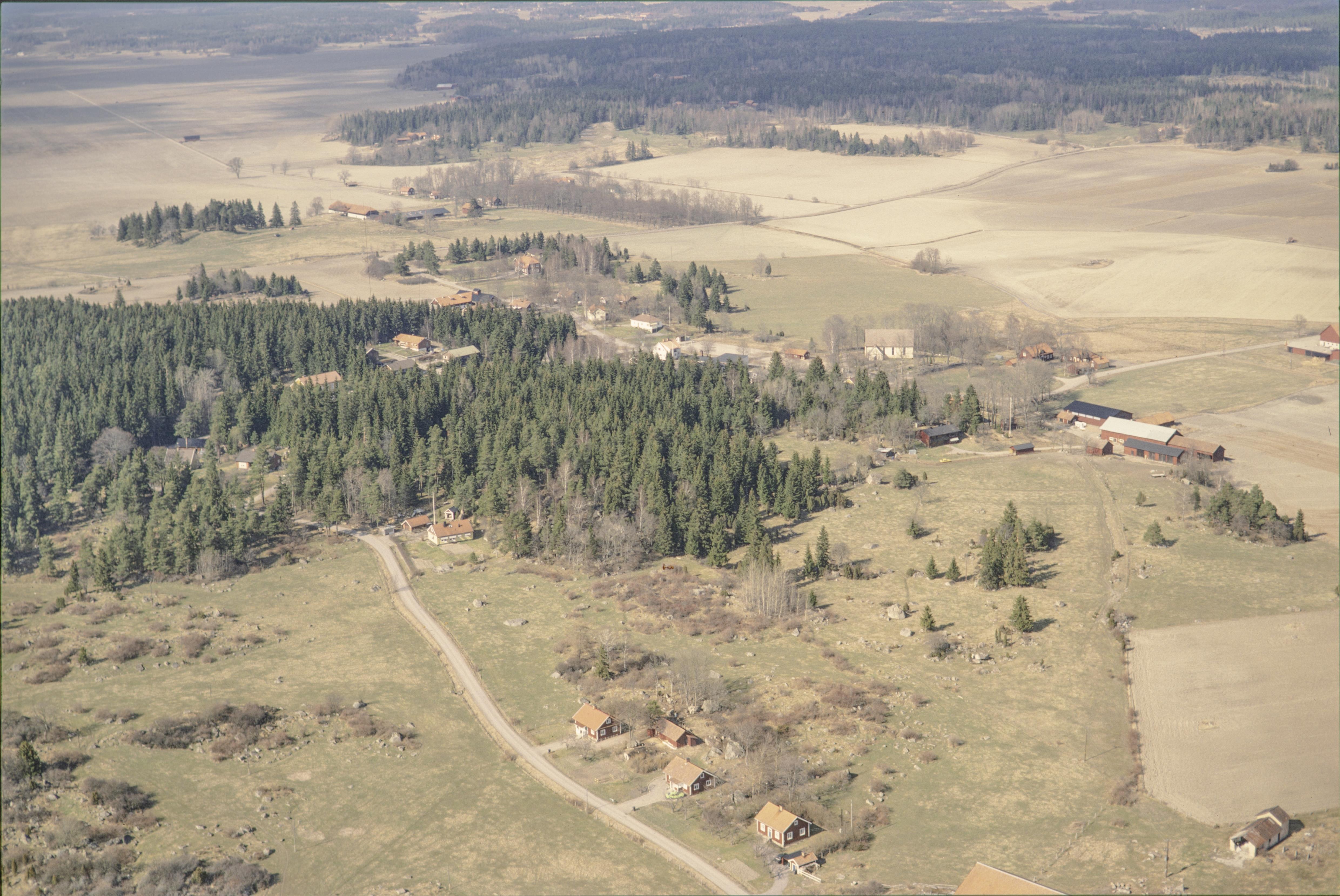 Beskrivning: Lagga kyrka till höger om bildens mitt. I bildens övre del Kasby herrgård. Bilden är tagen mot (väderstreck): N