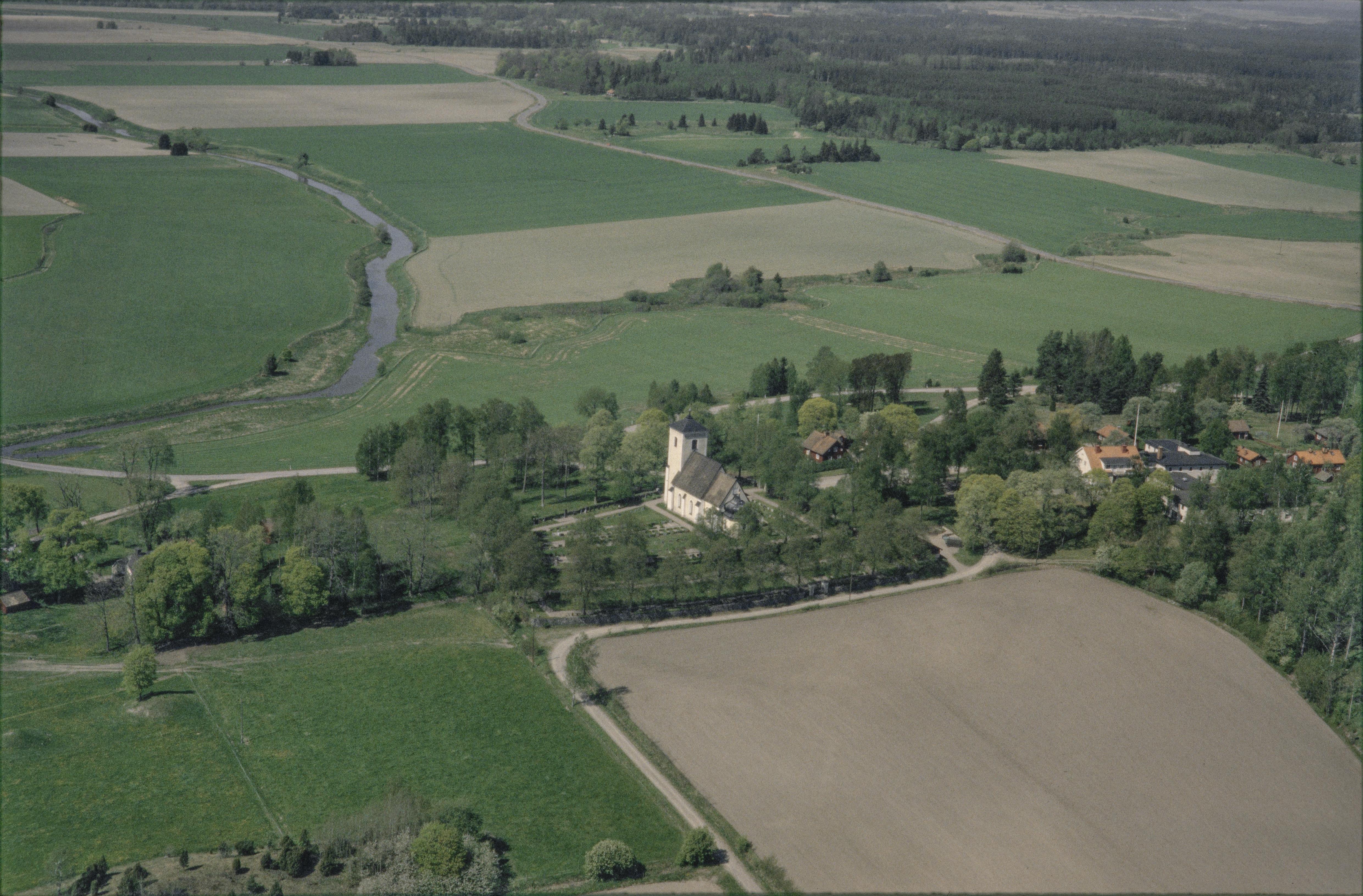 Beskrivning: Lena kyrka och kyrkby. Fyrisån till vänster. Bilden är tagen mot (väderstreck): NV