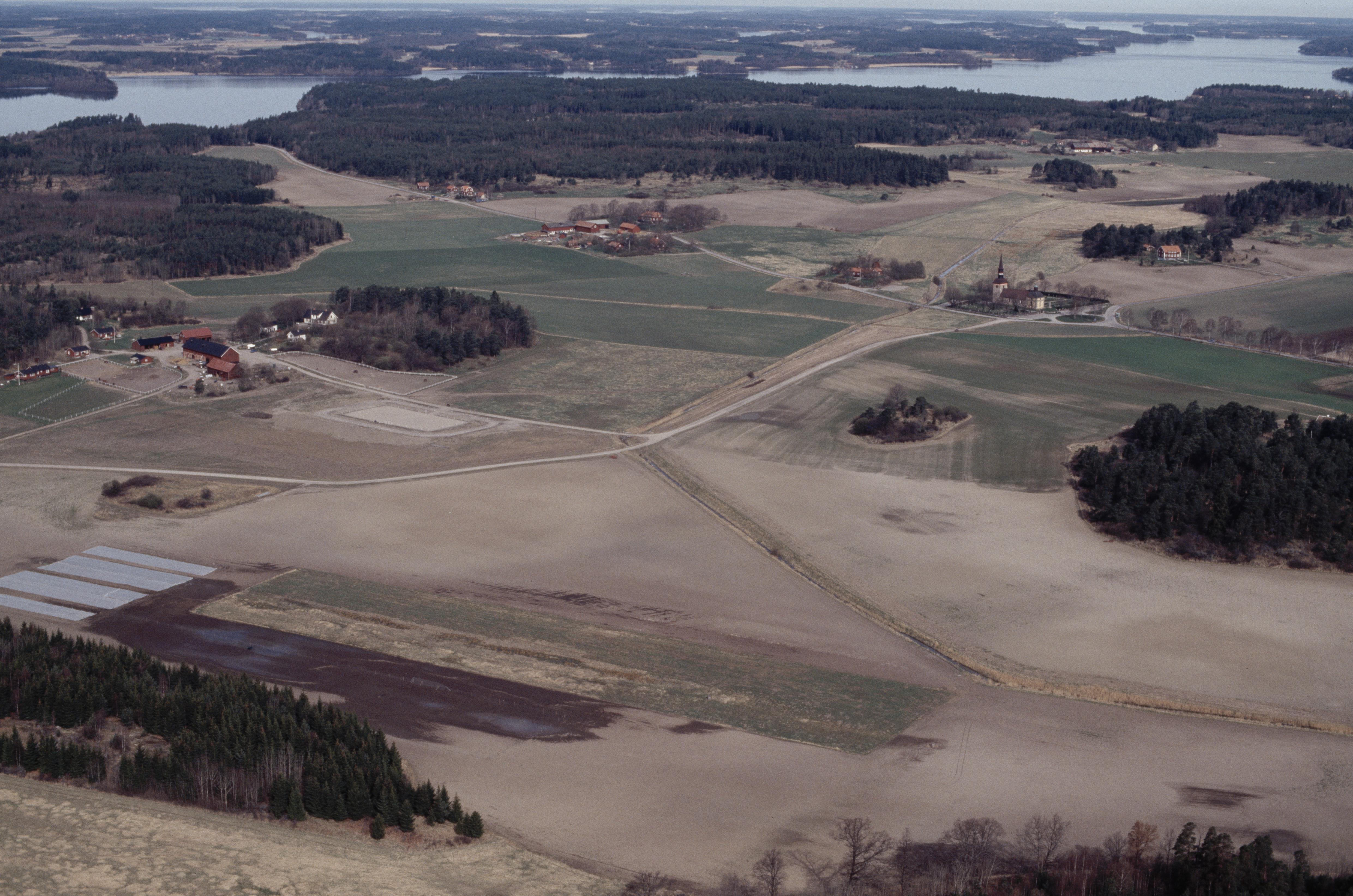 Beskrivning: Lovön. Gravfält RAÄnr Lovö 34:1 och 35:1 m.fl. till höger vid bildens mitt. I bildens övre del Lovö kyrka och prästgård. Bilden är tagen mot (väderstreck): NV