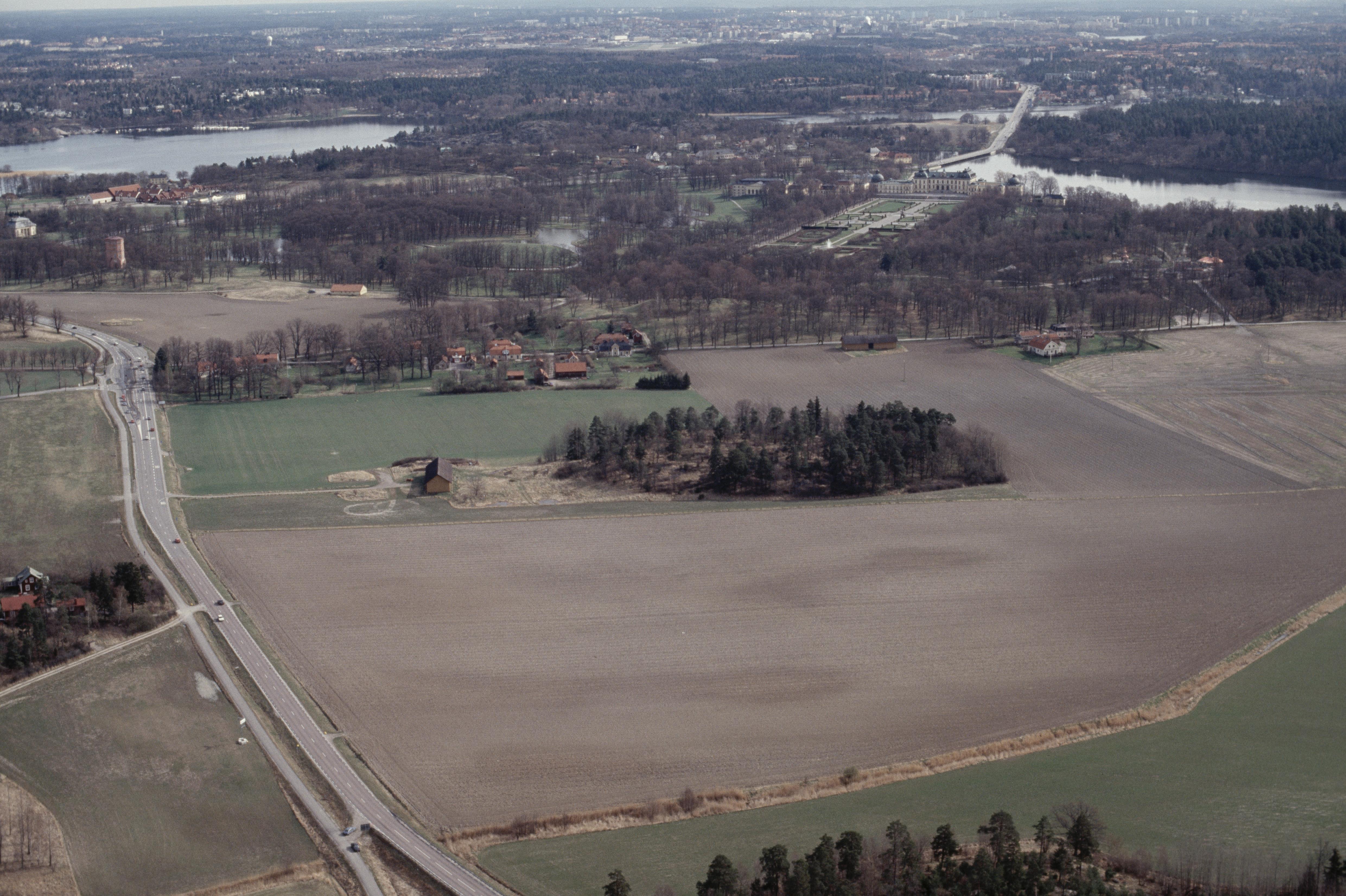 Beskrivning: Vid bildens mitt åkerholme med gravfält och boplats RAÄnr Lovö 195, 263 m.fl. I bildens övre del Drottningholms slott statligt byggnadsminne RAÄnr Lovö 92:1-9. Bilden är tagen mot (väderstreck): NO