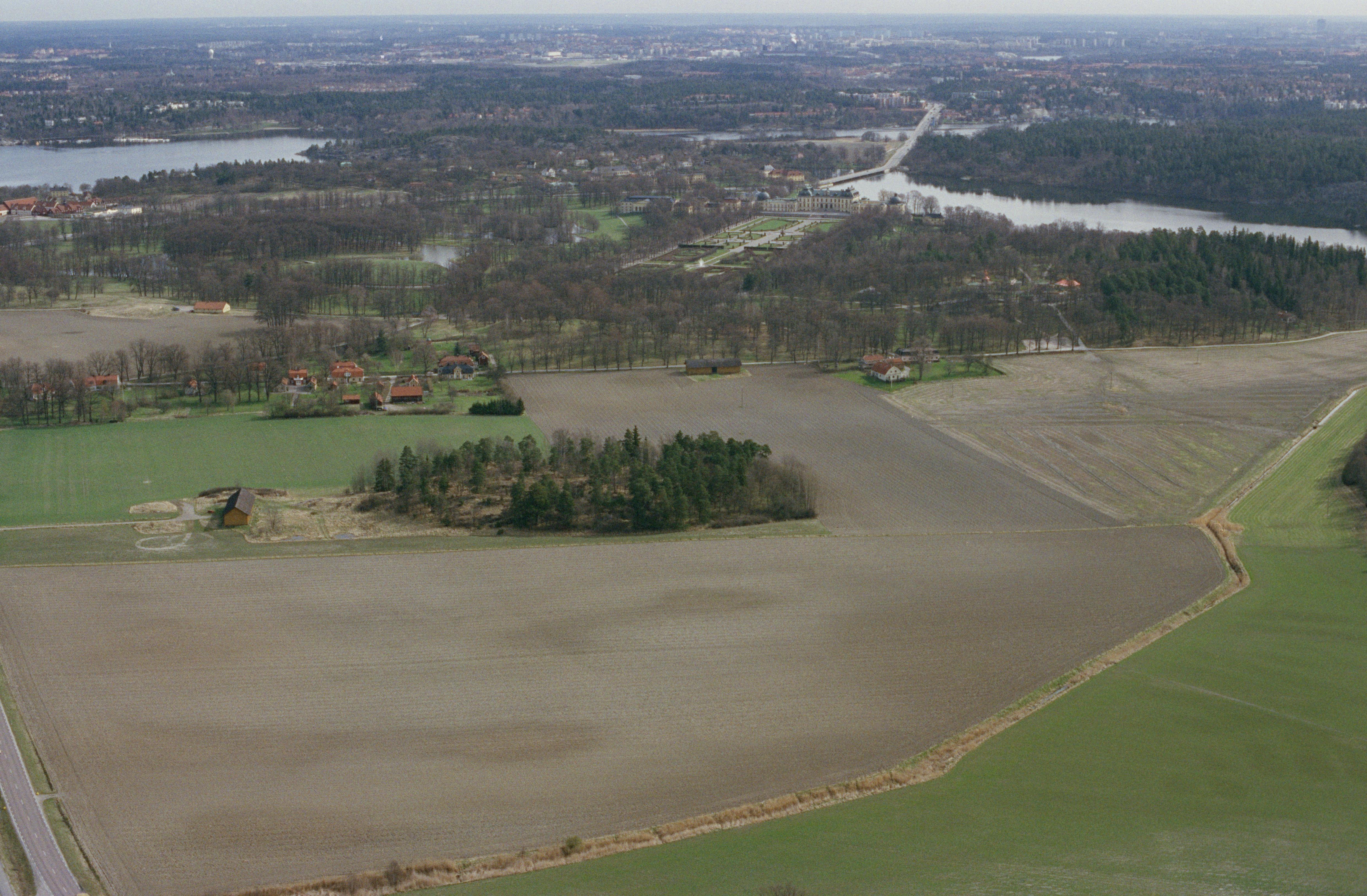 Beskrivning: Vid bildens mitt åkerholme med gravfält och boplats RAÄnr Lovö 195, 263 m.fl. I bildens övre del Drottningholms slott statligt byggnadsminne RAÄnr Lovö 92:1-9. Bilden är tagen mot (väderstreck): NO