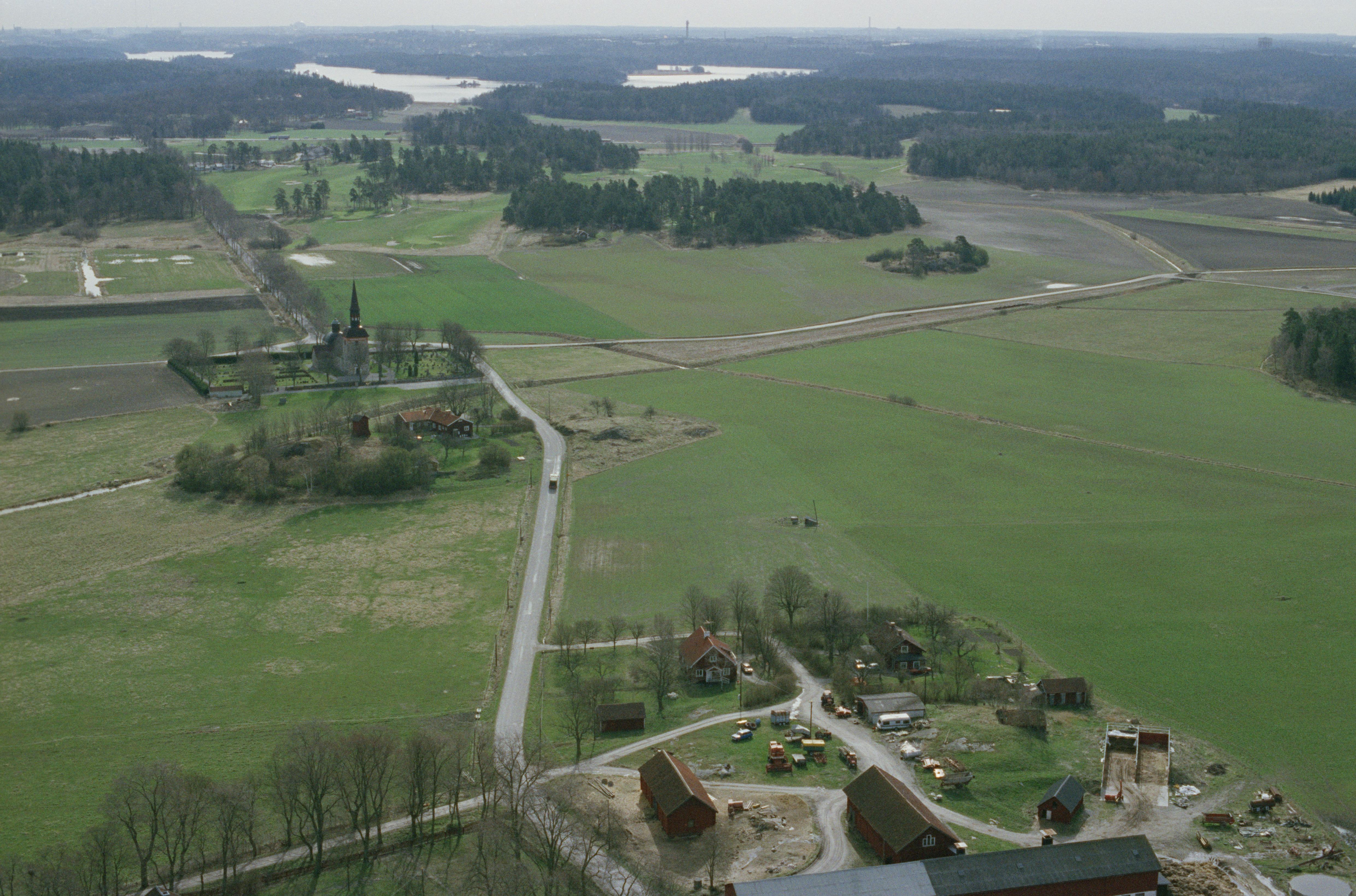 Beskrivning: Till vänster Lovö kyrka och klockarboställe på Lovön. I bildens nedre del Lovö prästgård. Bilden är tagen mot (väderstreck): OSO