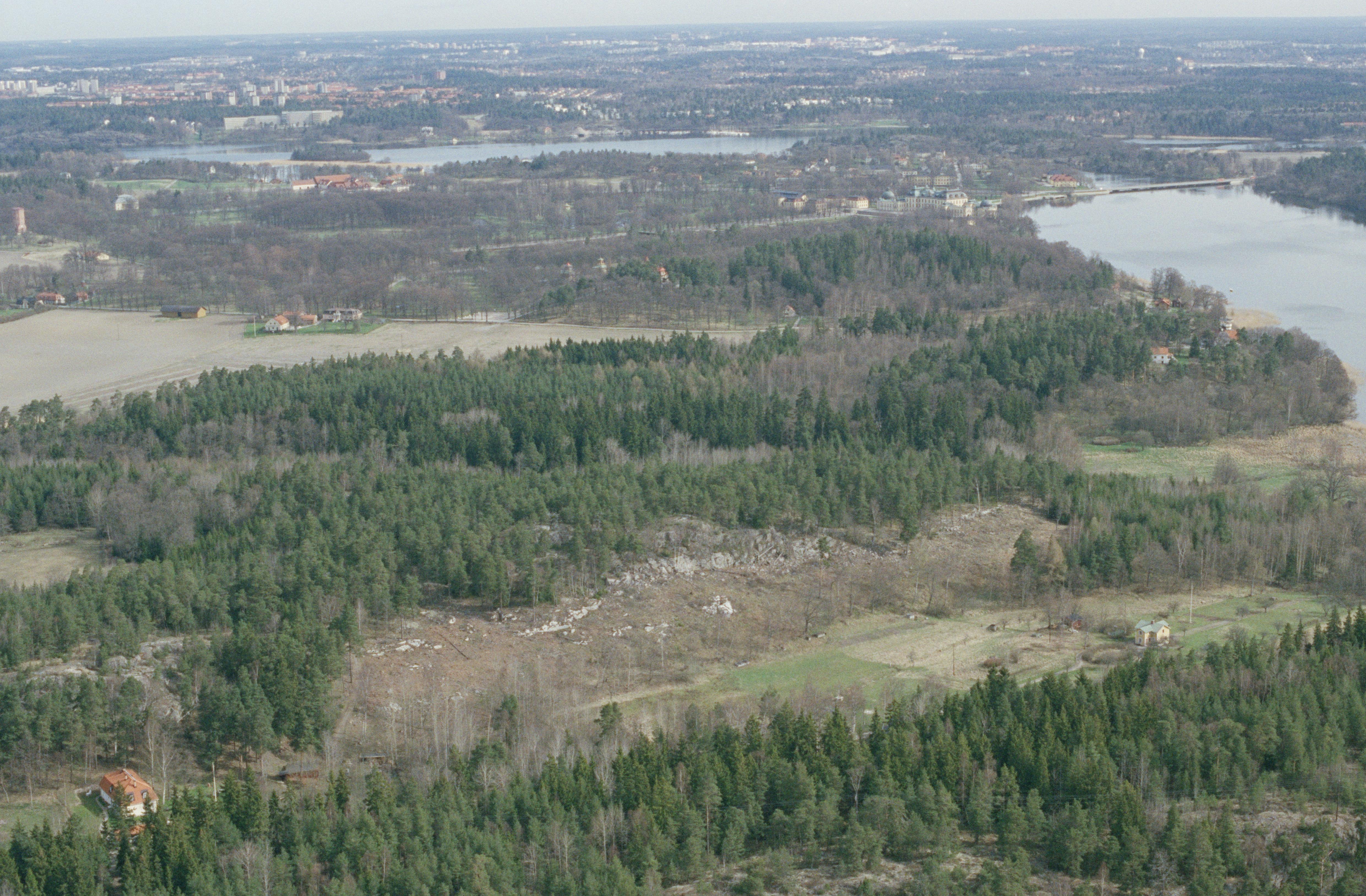 Beskrivning: Bergdalen på Lovön. Till höger Oskarsborg och stensättning RAÄnr Lovö 52:1. I bildens övre del rottningholms slott statligt byggnadsminne RAÄnr Lovö 92:1-9 på Lovön. Bilden är tagen mot (väderstreck): N