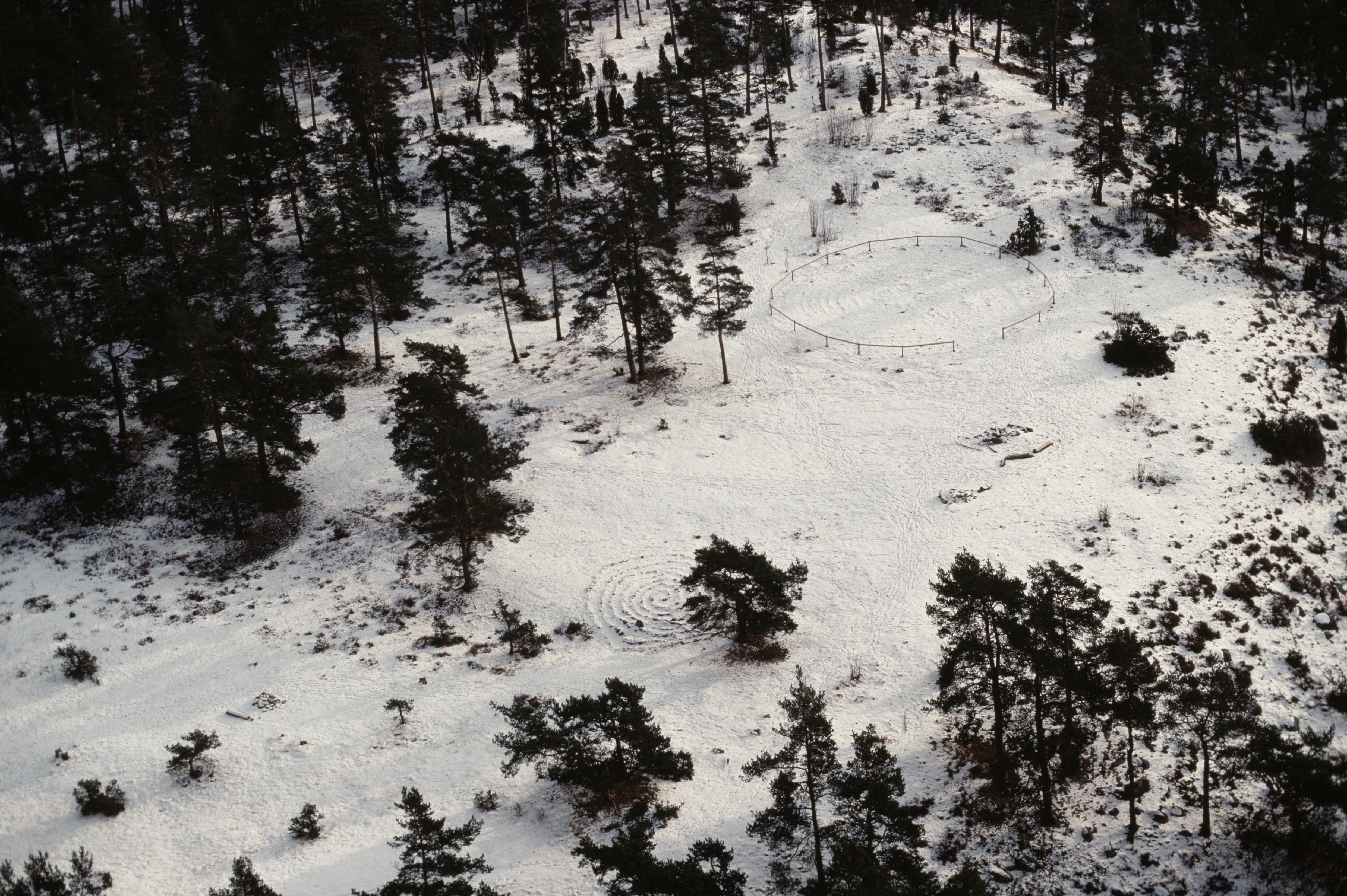 Beskrivning: Rösaringsåsen. Vid bildens mitt en sentida, ny labyrint. Uppe till höger labyrint RAÄnr Låssa 24:1 vid gravfält Låssa 23:1. I bildens övre del södra änden av färdväg (Rösarings processionsväg) RAÄnr Låssa 85:1. Bilden är tagen mot (väderstreck): NO