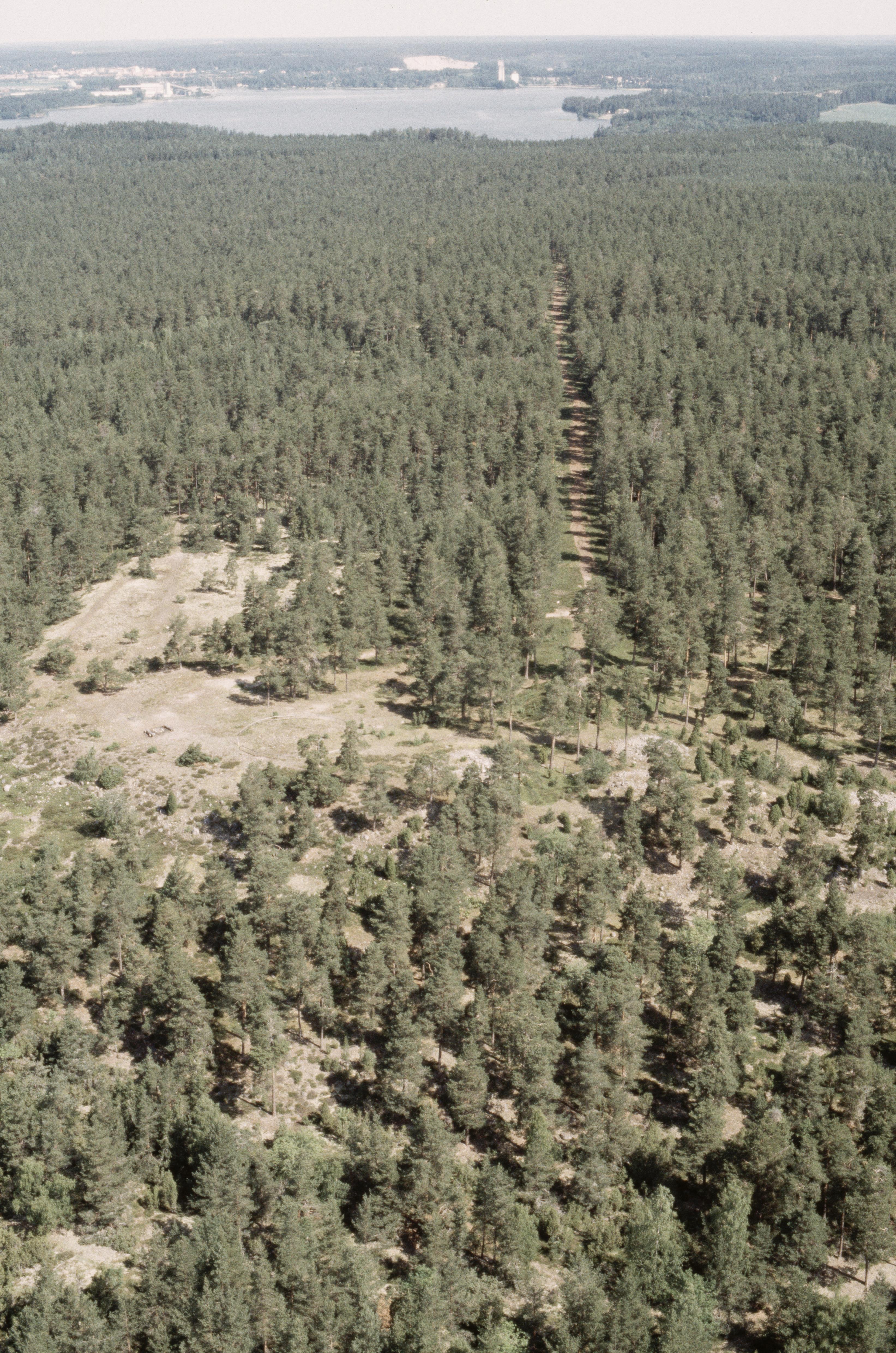 Beskrivning: Rösaringsåsen. Nere till vänster labyrint RAÄnr Låssa 24:1 24:1 och till höger gravfält Låssa 23:1. I bildens övre del färdväg (Rösarings processionsväg) RAÄnr Låssa 85:1 mot Kalmarviken i Mälaren. Bilden är tagen mot (väderstreck): N