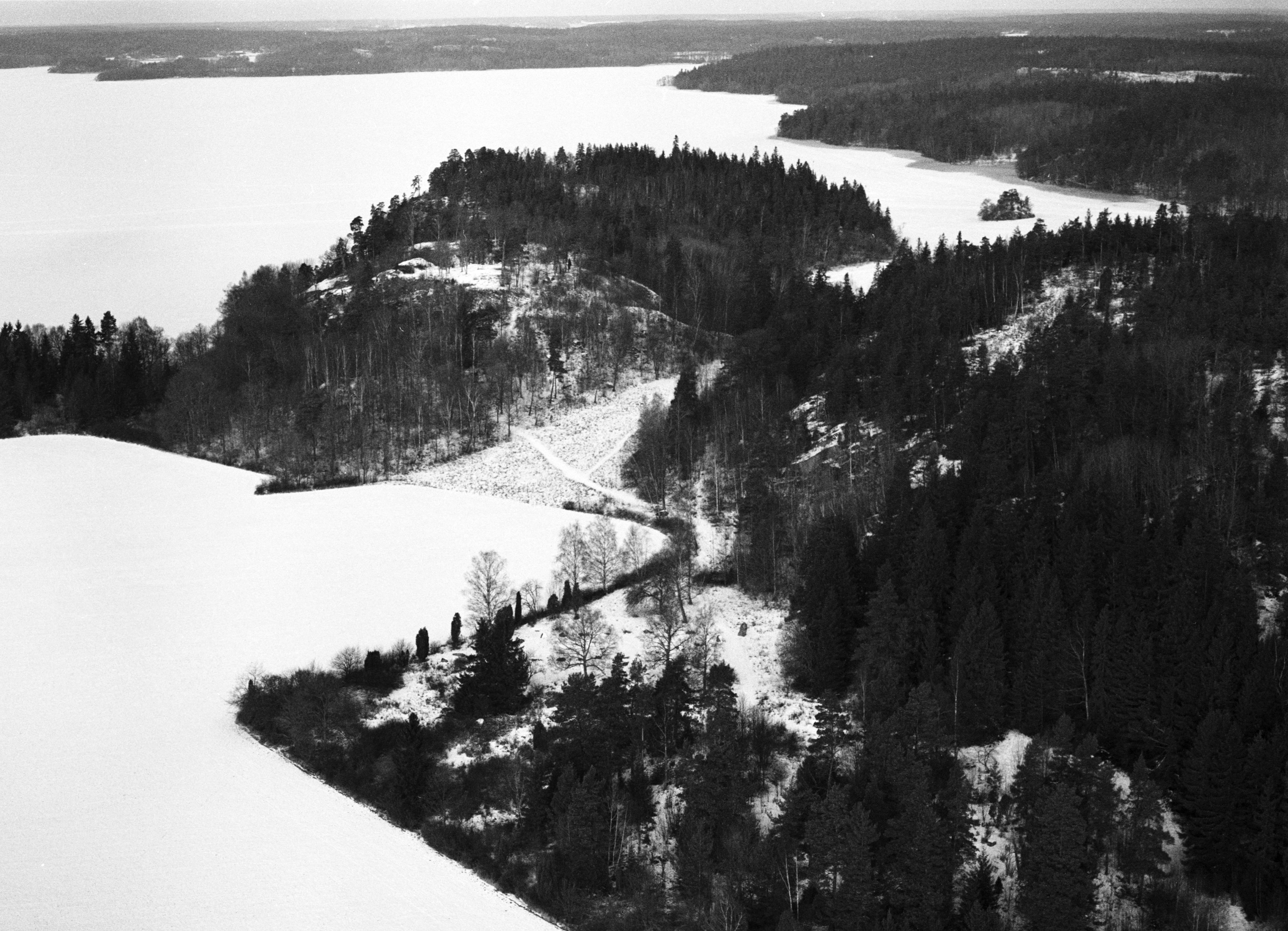 Beskrivning: Runsa gravfält med skeppssättning RAÄnr Ed 1:1. Uppe till höger Runsa fornborg / ?Runsa borg? RAÄnr Ed 2:1. Norrsunda socken i bildens övre del. Bilden är tagen mot (väderstreck): NV