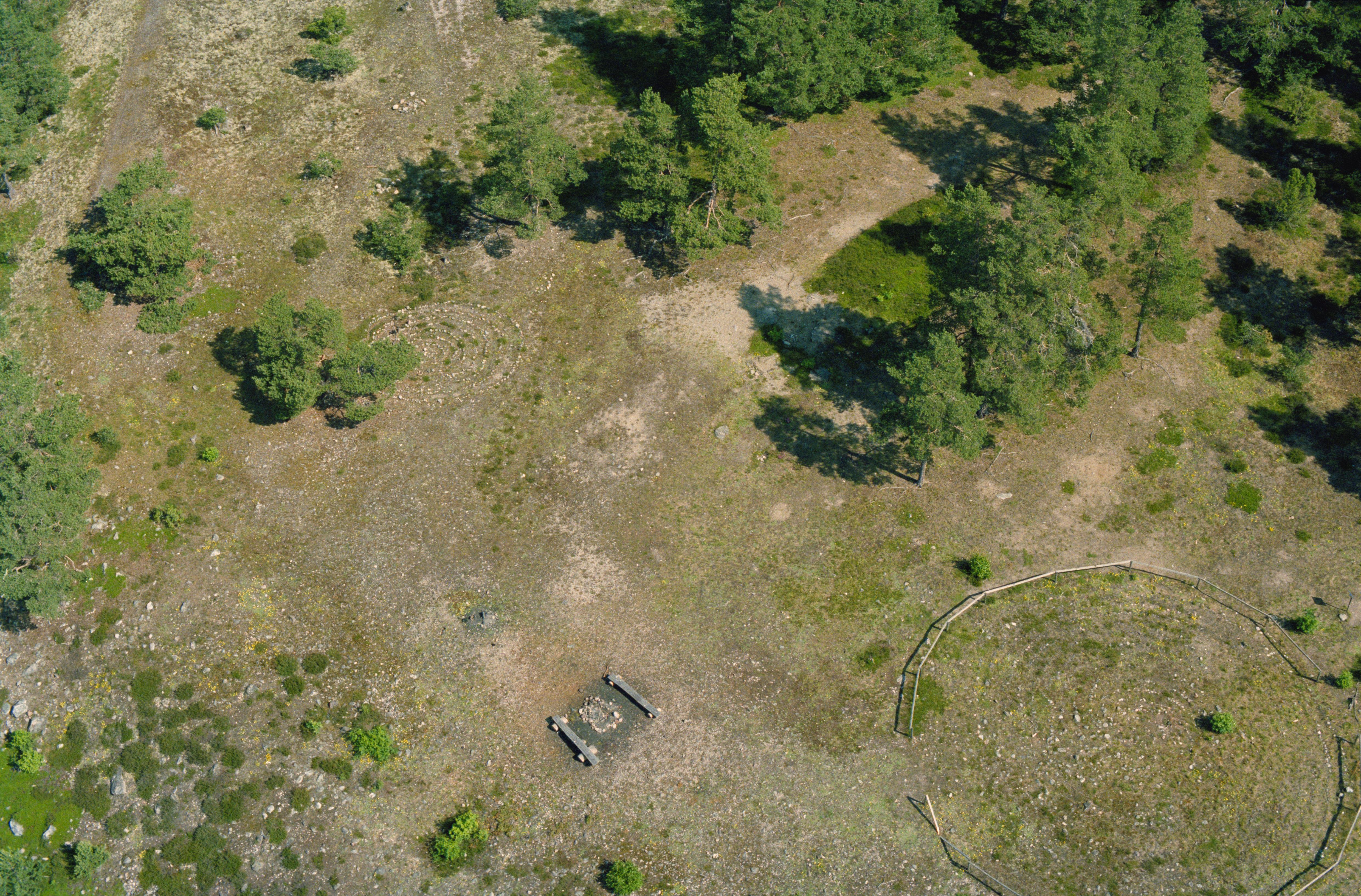 Beskrivning: Rösaringsåsen. Uppe till vänster en ny, sentida labyrint och till höger labyrint RAÄnr Låssa 24:1 vid södra änden av färdväg (Rösarings processionsväg) RAÄnr Låssa 85:1. Bilden är tagen mot (väderstreck): NV
