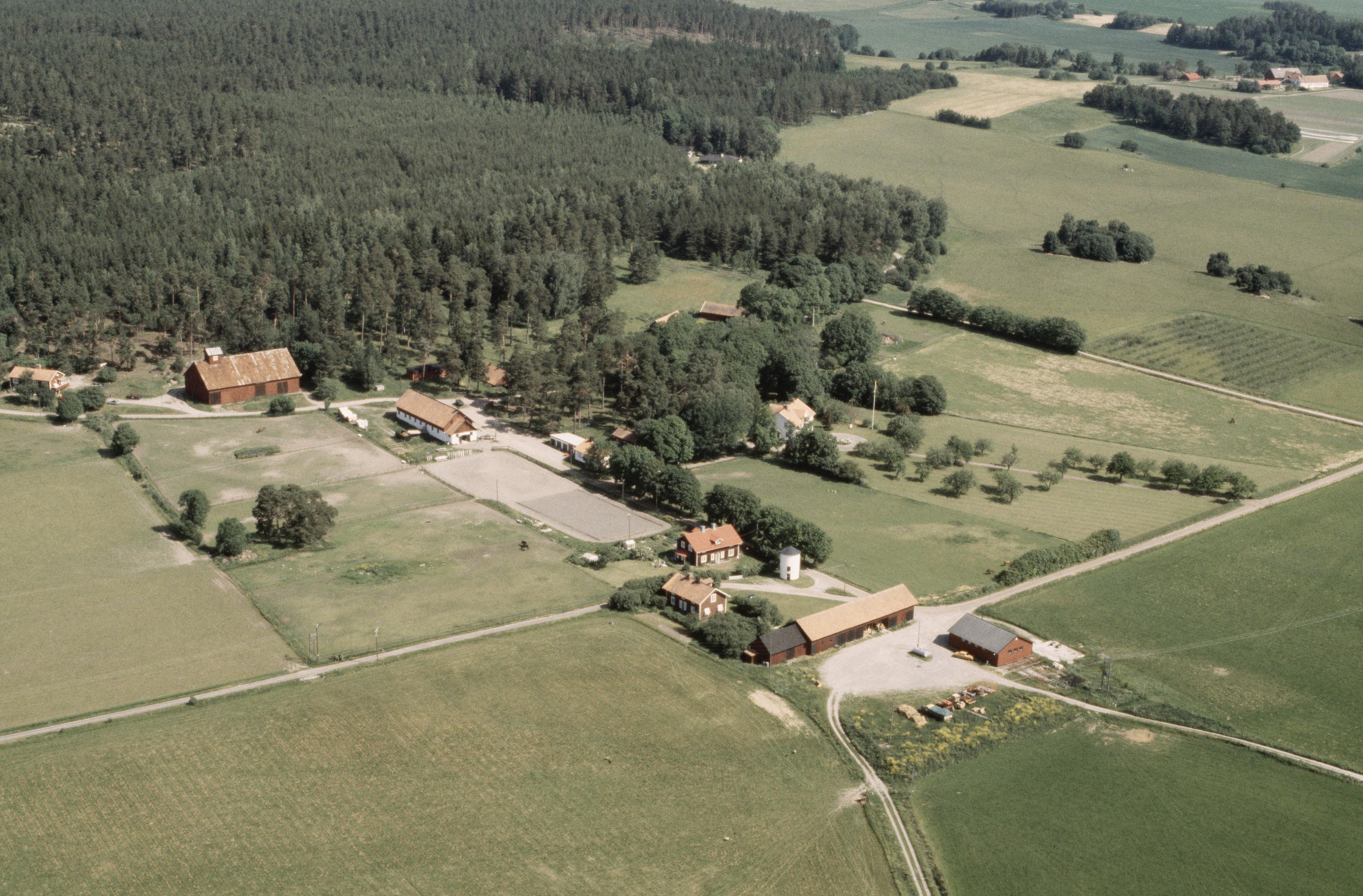 Beskrivning: Stora Ekeby gård. I bildens övre del gravfält RAÄnr Låssa 20:1. Bilden är tagen mot (väderstreck): N
