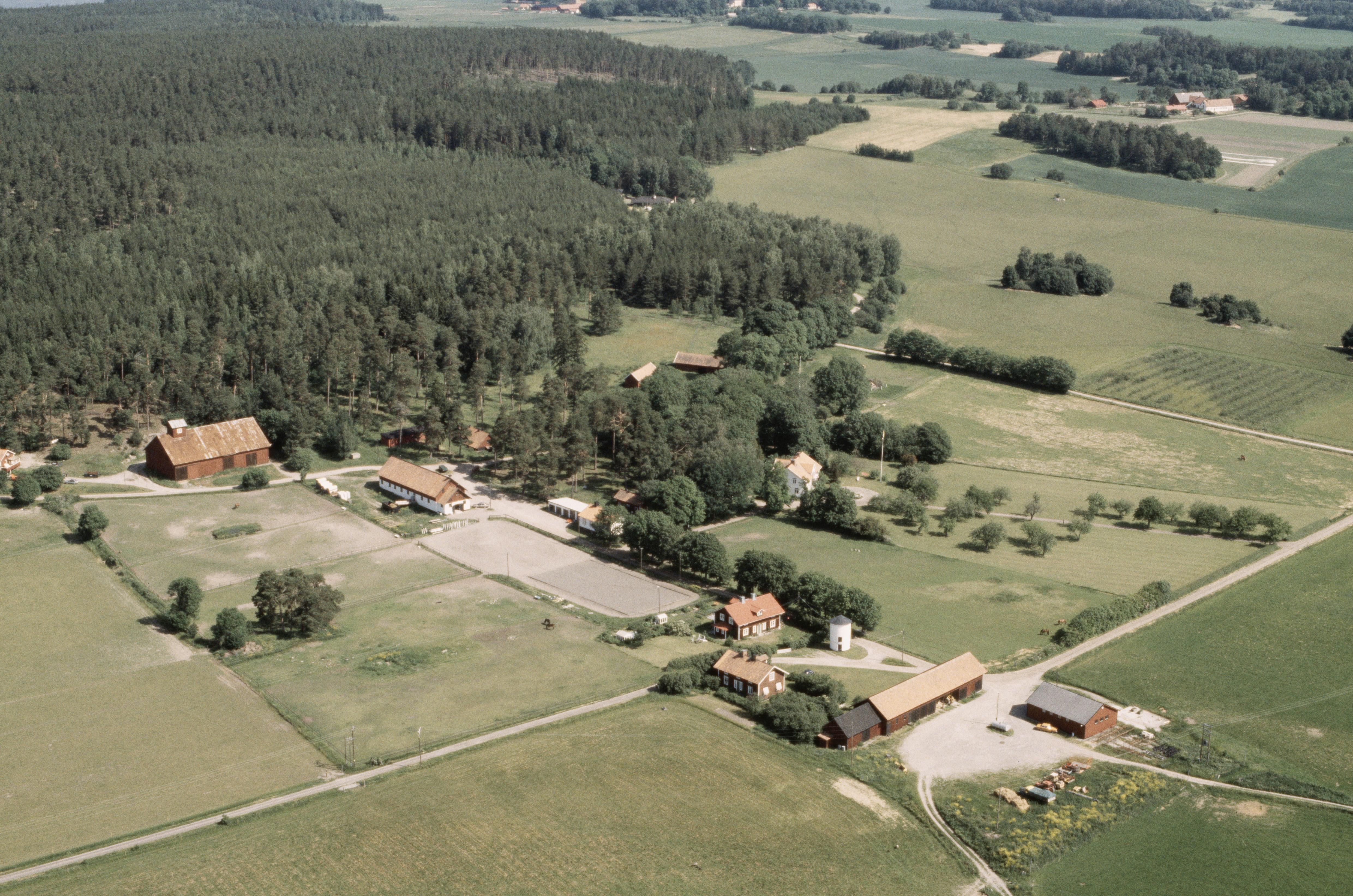Beskrivning: Stora Ekeby gård. I bildens övre del gravfält RAÄnr Låssa 20:1. Bilden är tagen mot (väderstreck): N
