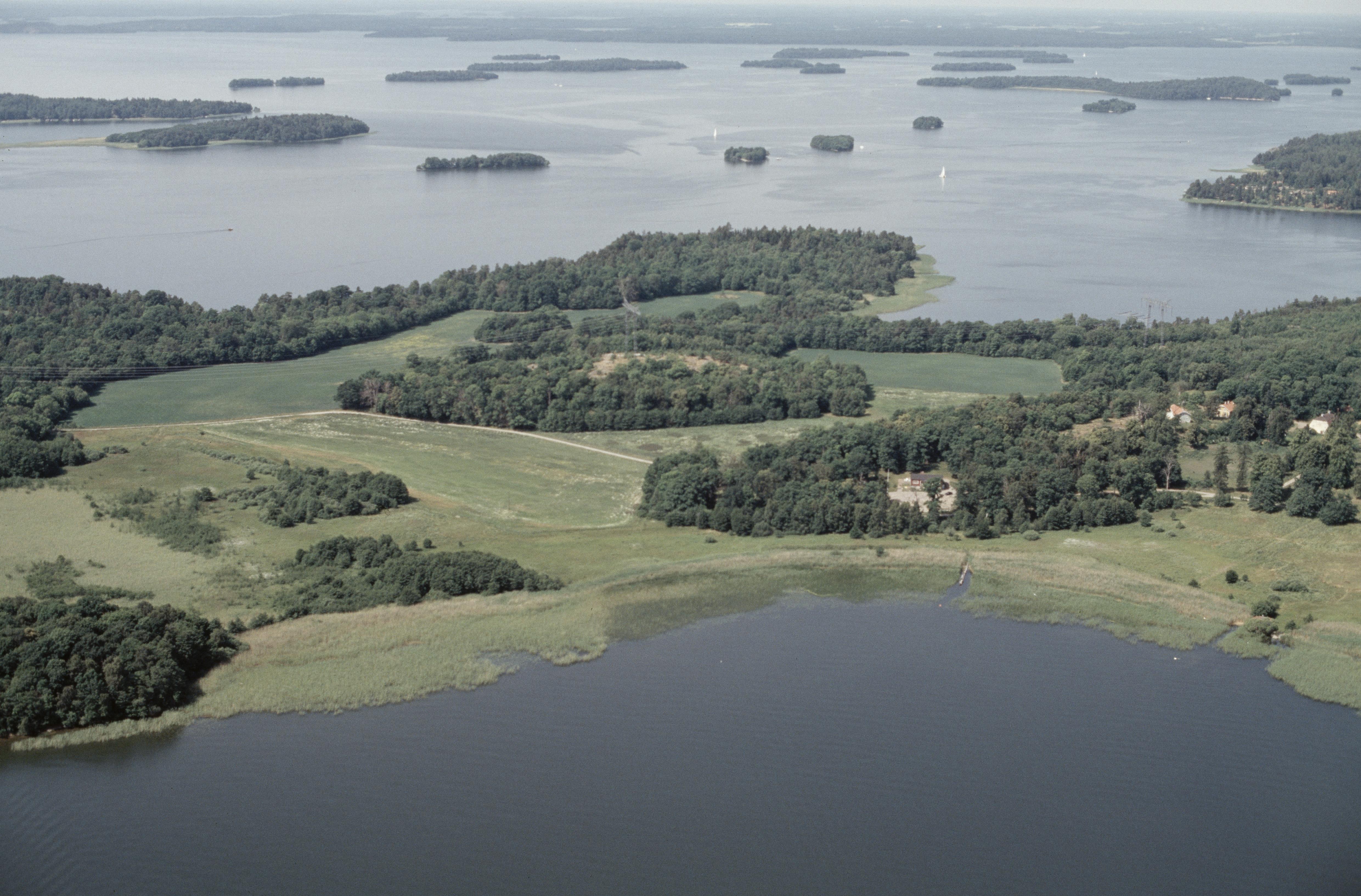Beskrivning: Söder om Ådö herrgård på Lagnö mellan Brofjärden och Norra Björkfjärden i Mälaren. Vid bildens mitt Kvarnberget med grund av väderkvarn RAÄnr Låssa 54:1. Bilden är tagen mot (väderstreck): VNV