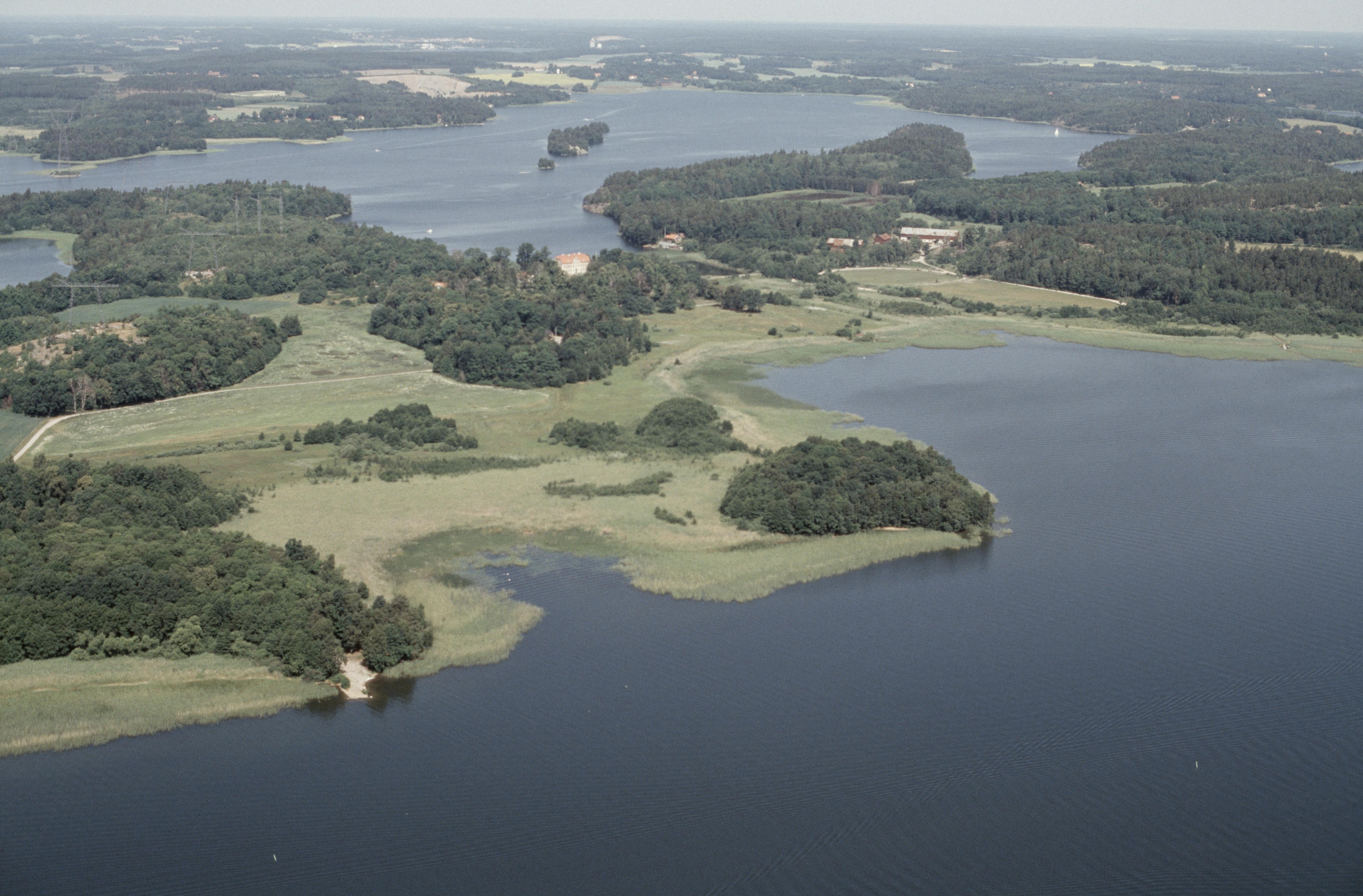 Beskrivning: Ådö herrgård på Lagnö mellan Brofjärden och Norra Björkfjärden i Mälaren. Till vänster om bildens mitt Kvarnberget med grund av väderkvarn RAÄnr Låssa 54:1. Bilden är tagen mot (väderstreck): NV