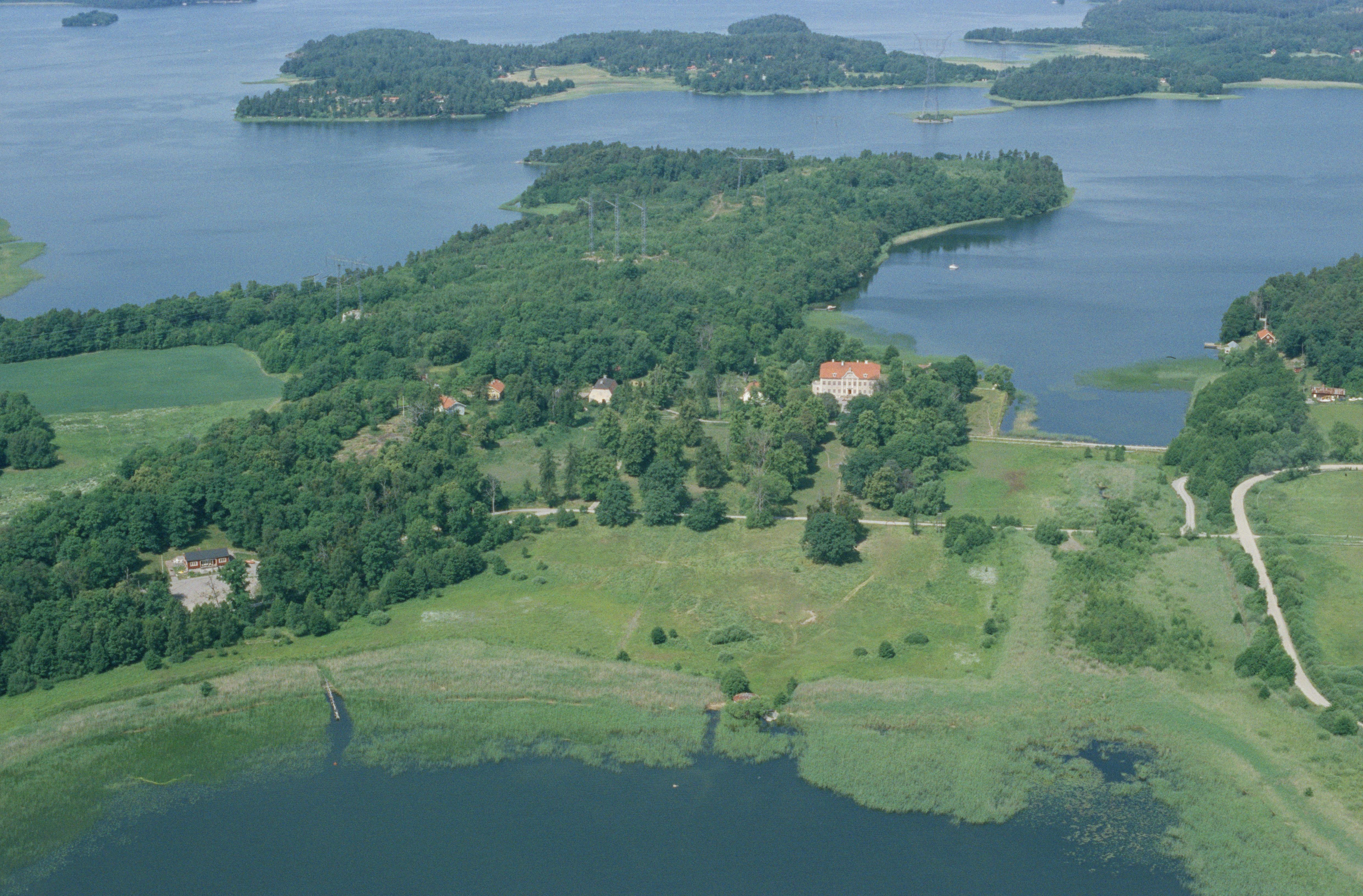 Beskrivning: Ådö herrgård på Lagnö mellan Brofjärden och Norra Björkfjärden i Mälaren. Till höger om bildens mitt bro RAÄnr Låssa 78:1. Bilden är tagen mot (väderstreck): VNV