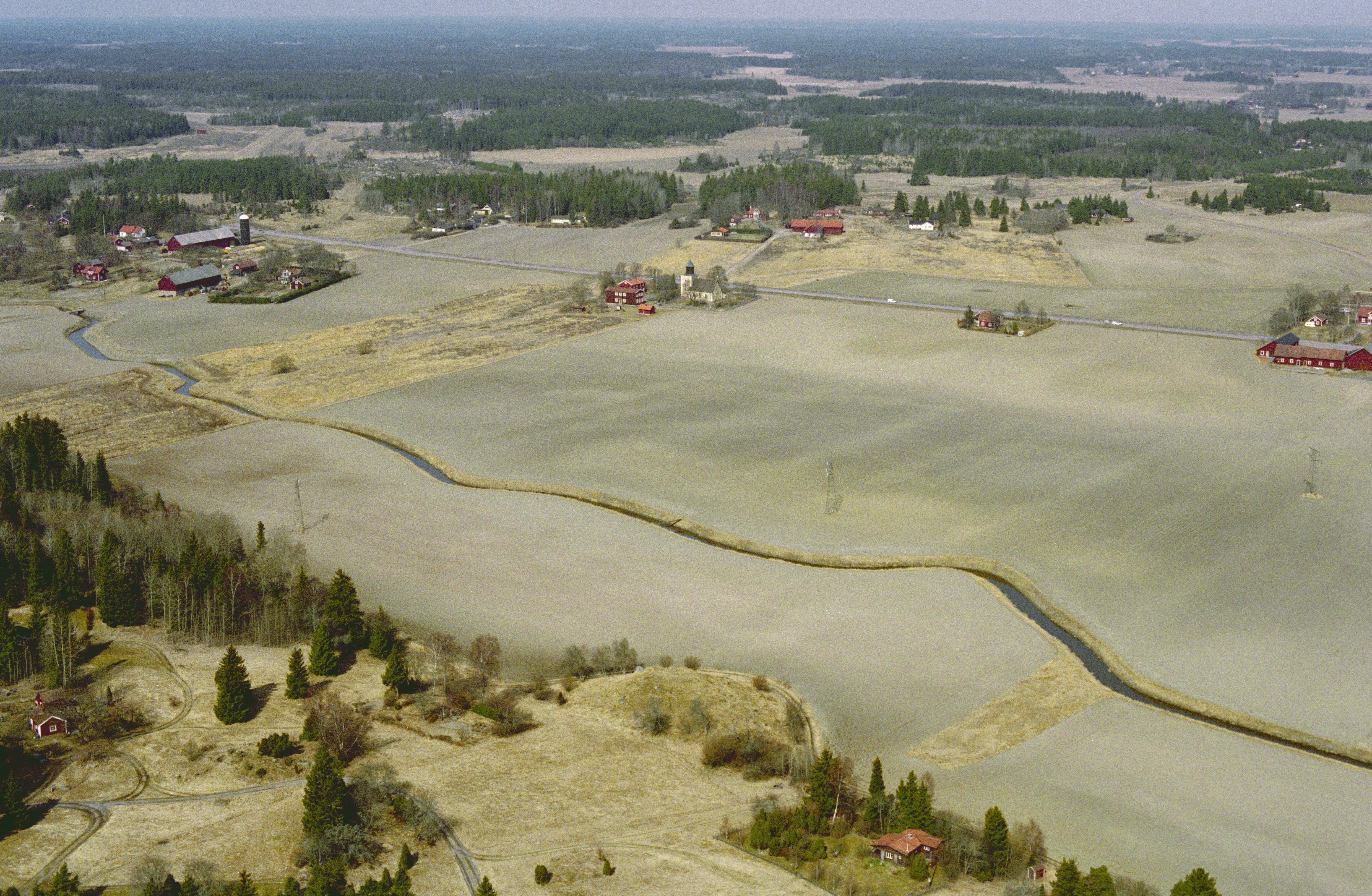 Beskrivning: Hågaåns dalgång vid Västerby och Läby kyrka. I bildens nedre del Vadbackahögen / Läby vadn RAÄnr Läby 18:1. Bilden är tagen mot (väderstreck): NV