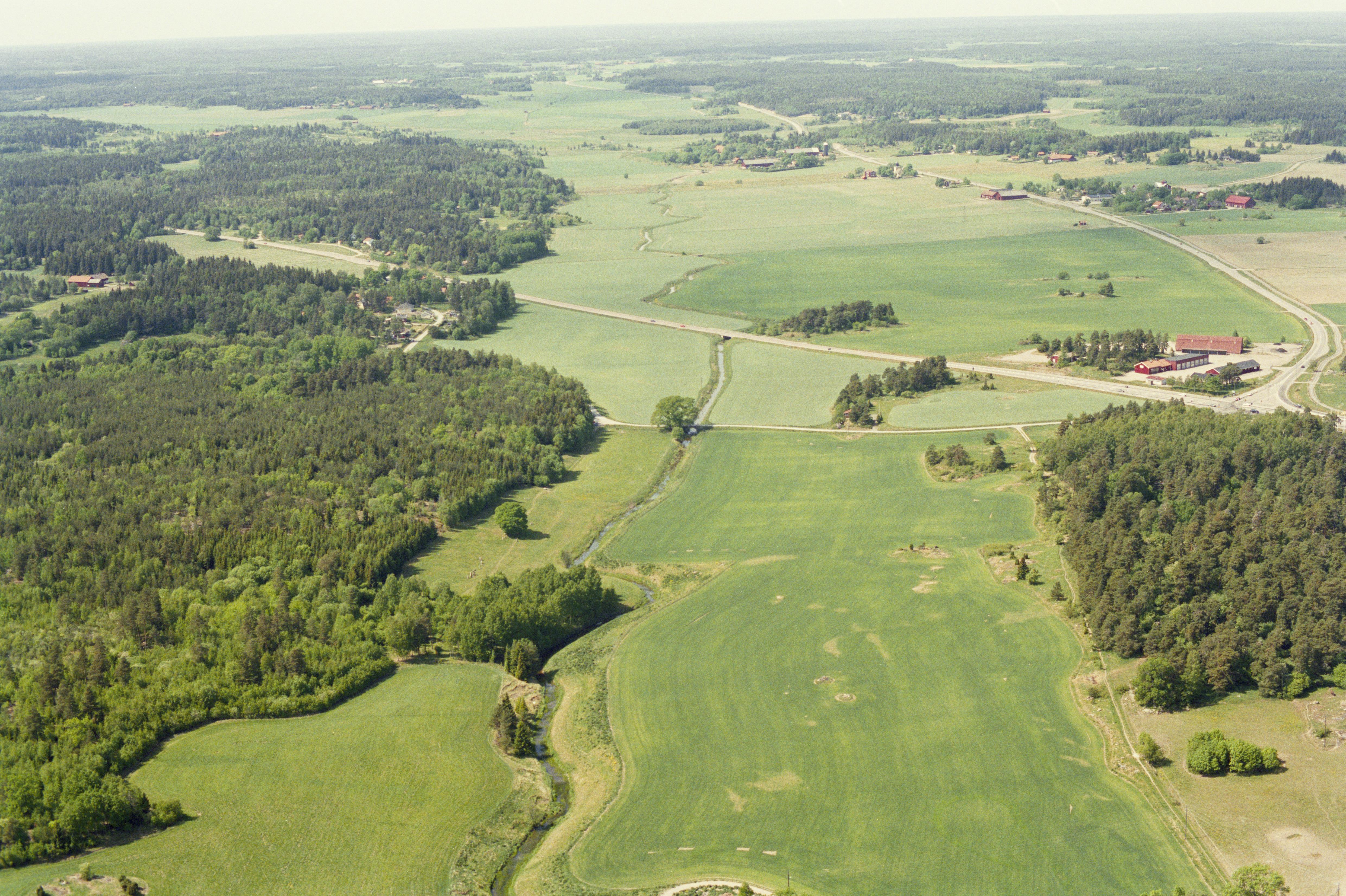 Beskrivning: Hågaåns dalgång i östra delen av Läby vad vid gränsen mot Uppsala socken (i bildens nedre kant), I bildens nedre del vadställe, färdväg och gravfält RAÄnr Läby 8:1-4. Vid bildens mitt Läbybron RAÄnr Läby 7:1-2 och i bildens övre del boplats RAÄnr Läby 21:1. Bilden är tagen mot (väderstreck): V