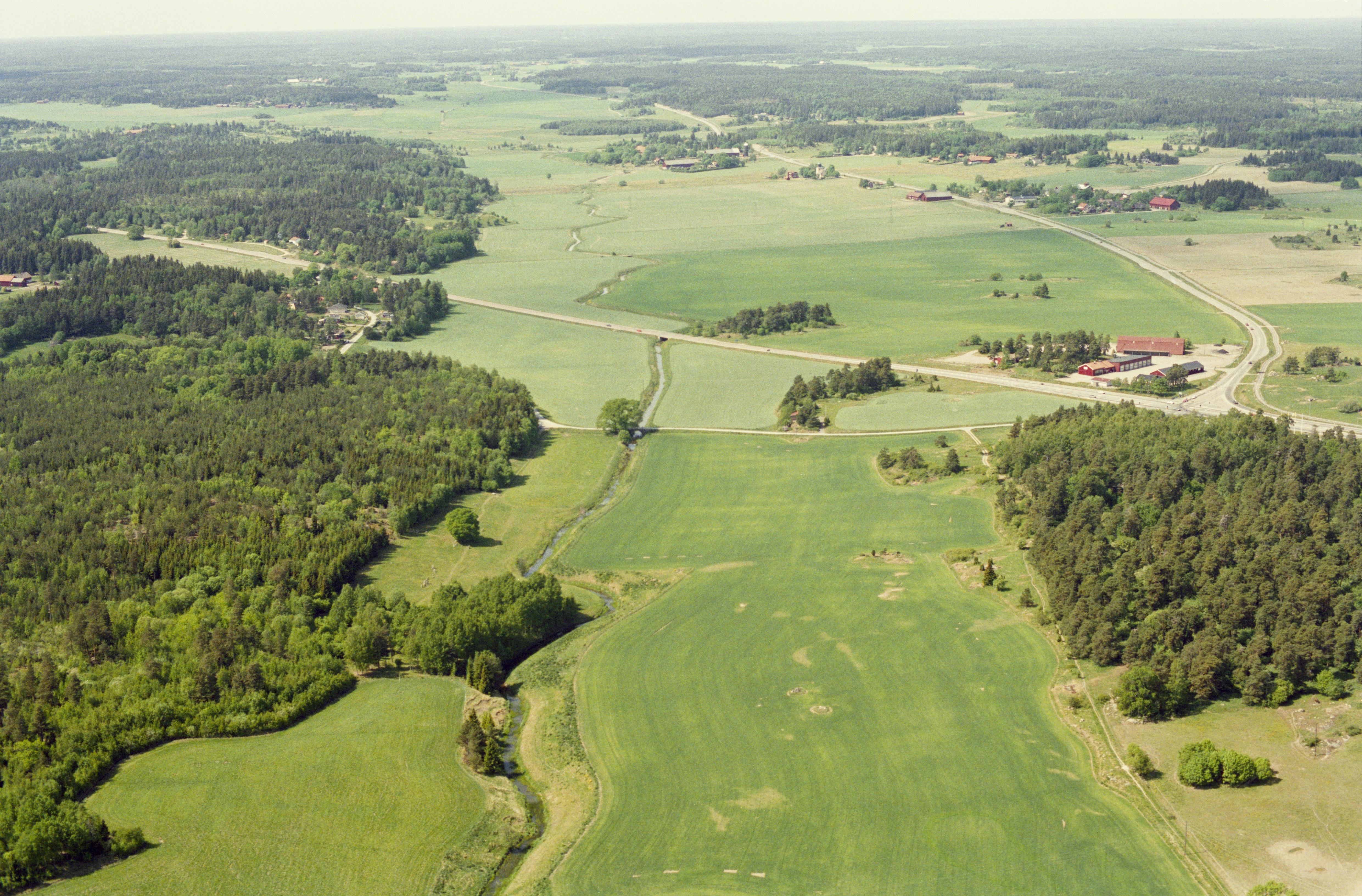 Beskrivning: Hågaåns dalgång i östra delen av Läby vad vid gränsen mot Uppsala socken (i bildens nedre kant), I bildens nedre del vadställe, färdväg och gravfält RAÄnr Läby 8:1-4. Vid bildens mitt Läbybron RAÄnr Läby 7:1-2 och i bildens övre del boplats RAÄnr Läby 21:1. Bilden är tagen mot (väderstreck): V