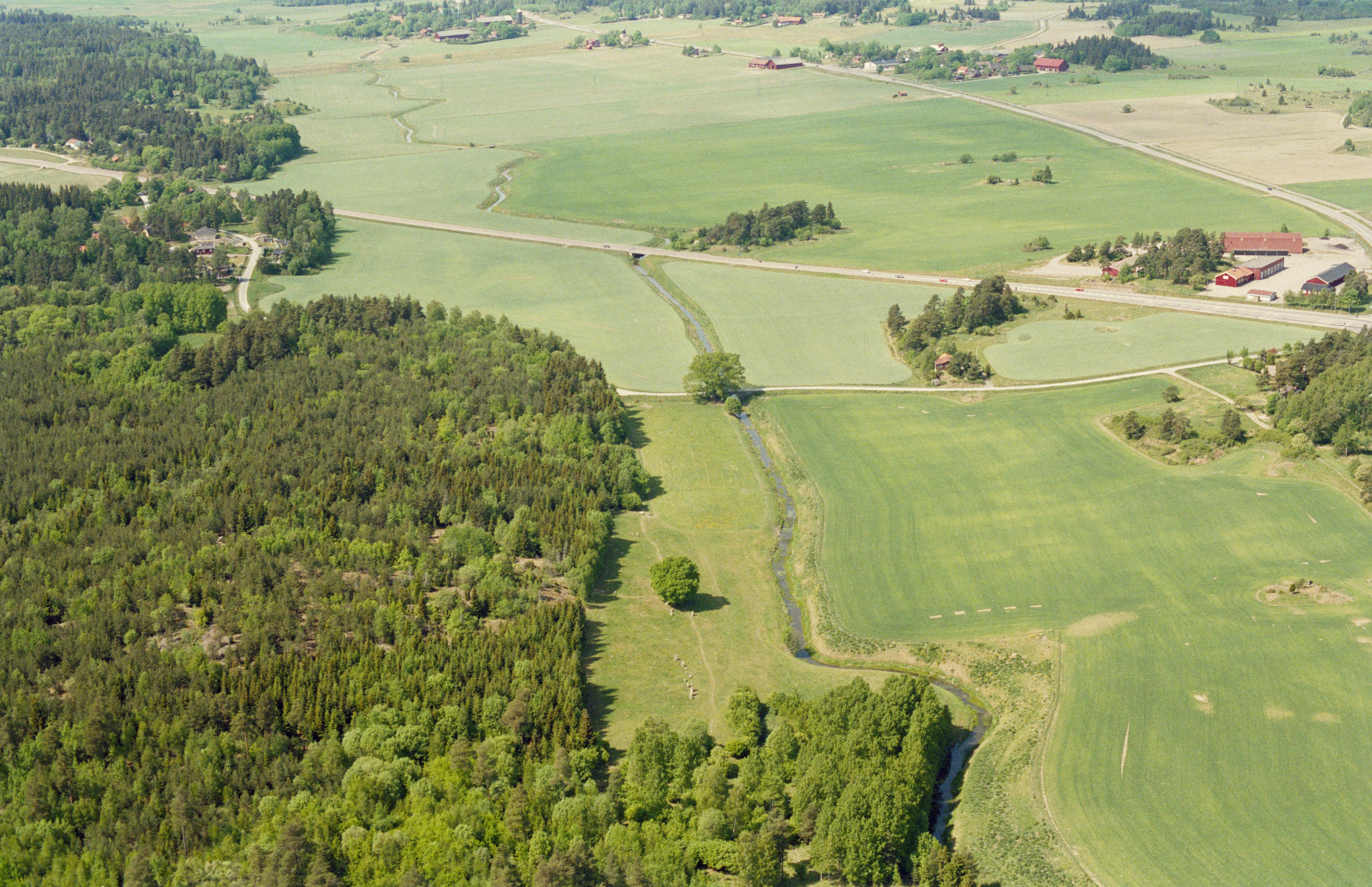 Beskrivning: Hågaåns dalgång i östra delen av Läby vad vid gränsen mot Uppsala socken (i bildens nedre kant), I bildens nedre del vadställe, färdväg och gravfält RAÄnr Läby 8:1-4. Vid bildens mitt Läbybron RAÄnr Läby 7:1-2 och i bildens övre del boplats RAÄnr Läby 21:1. Läby kyrka och kyrkby i bildens övre del. Bilden är tagen mot (väderstreck): NV