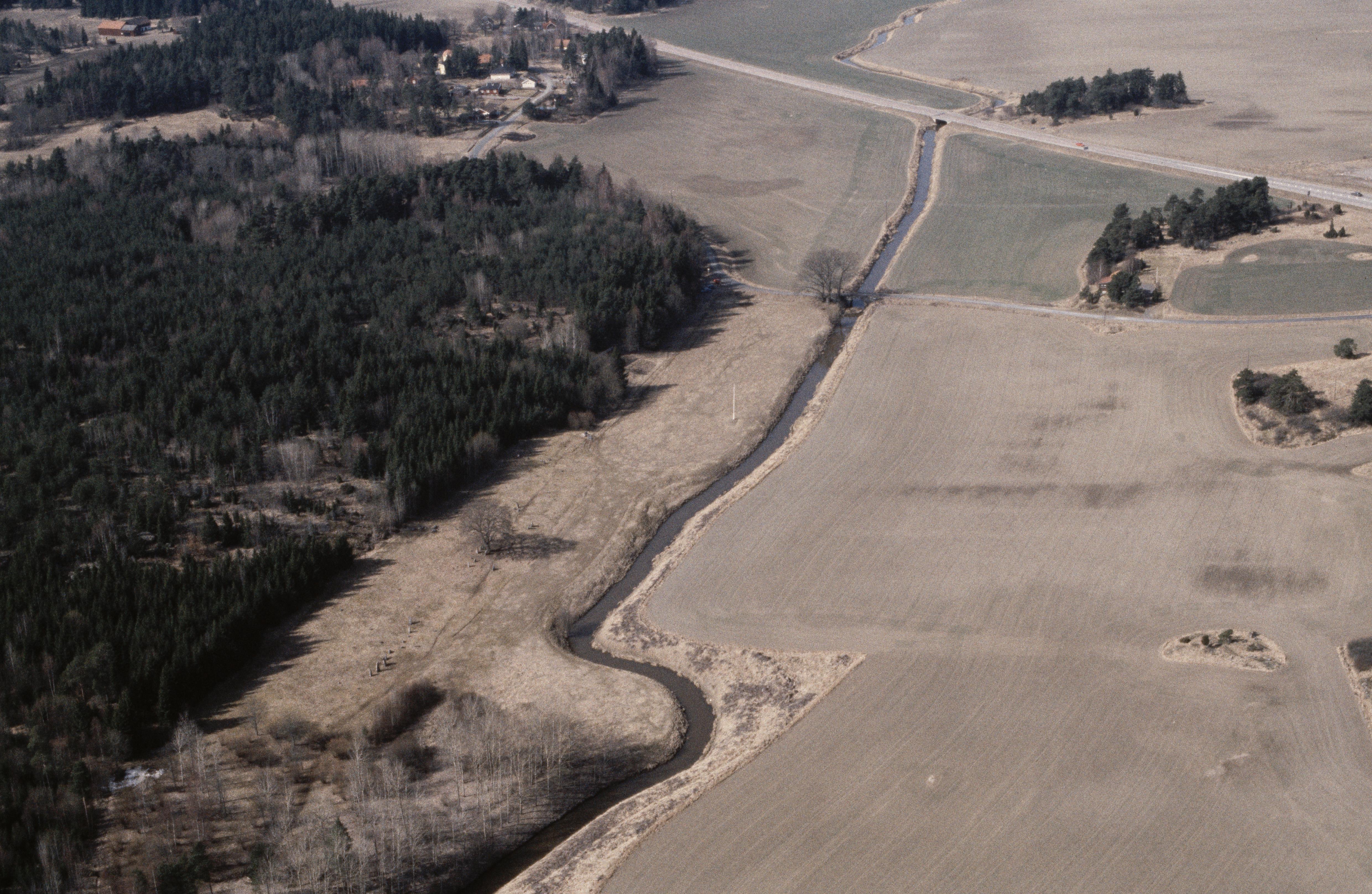 Beskrivning: Hågaåns dalgång i östra delen av Läby vad vid gränsen mot Uppsala socken (i bildens nedre kant), I bildens nedre del vadställe, färdväg och gravfält RAÄnr Läby 8:1-4. Över bildens mitt Läbybron RAÄnr Läby 7:1-2 och i bildens övre del boplats RAÄnr Läby 21:1. Bilden är tagen mot (väderstreck): V