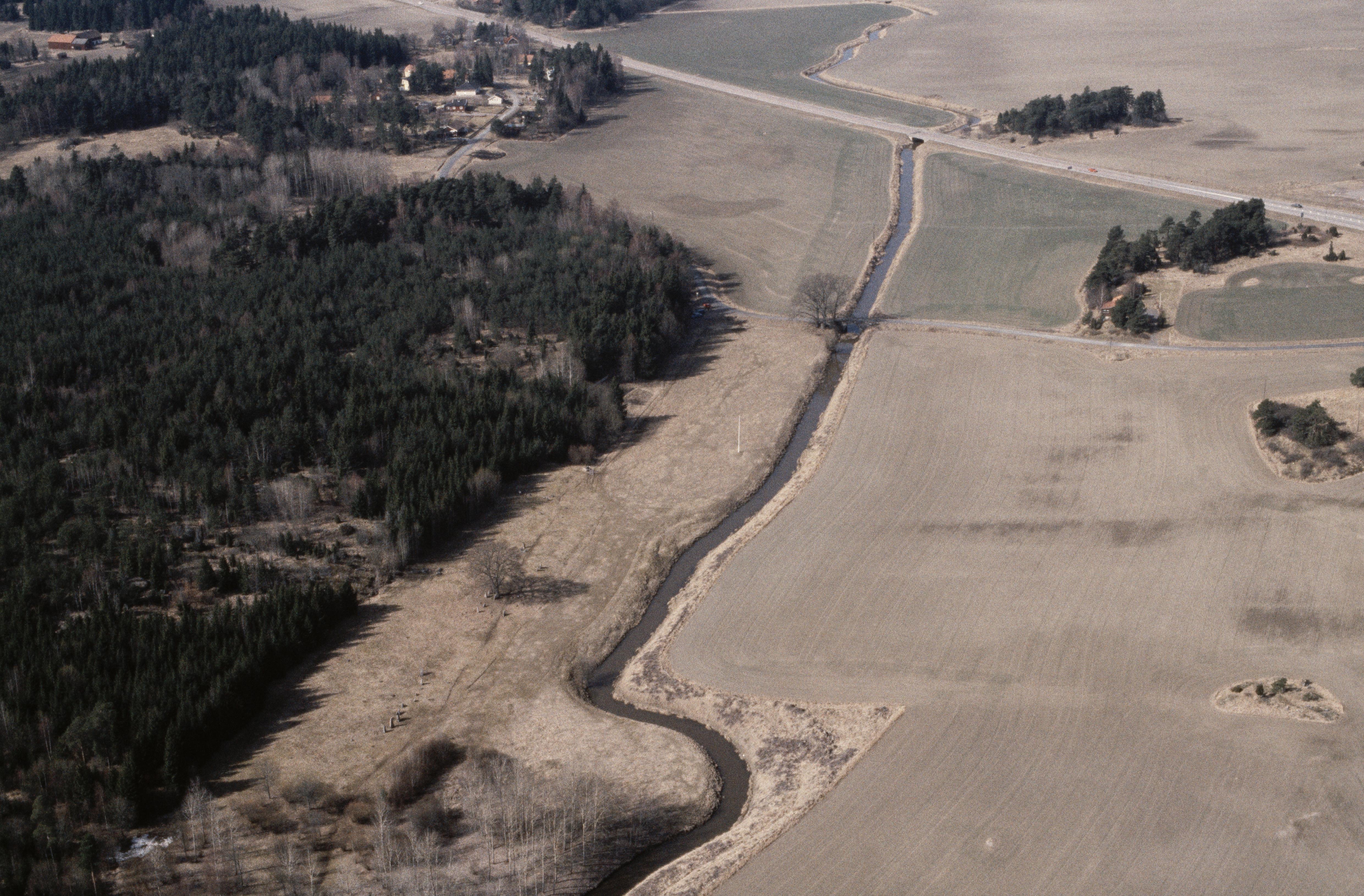 Beskrivning: Hågaåns dalgång i östra delen av Läby vad vid gränsen mot Uppsala socken (i bildens nedre kant), I bildens nedre del vadställe, färdväg och gravfält RAÄnr Läby 8:1-4. Över bildens mitt Läbybron RAÄnr Läby 7:1-2 och i bildens övre del boplats RAÄnr Läby 21:1. Bilden är tagen mot (väderstreck): V