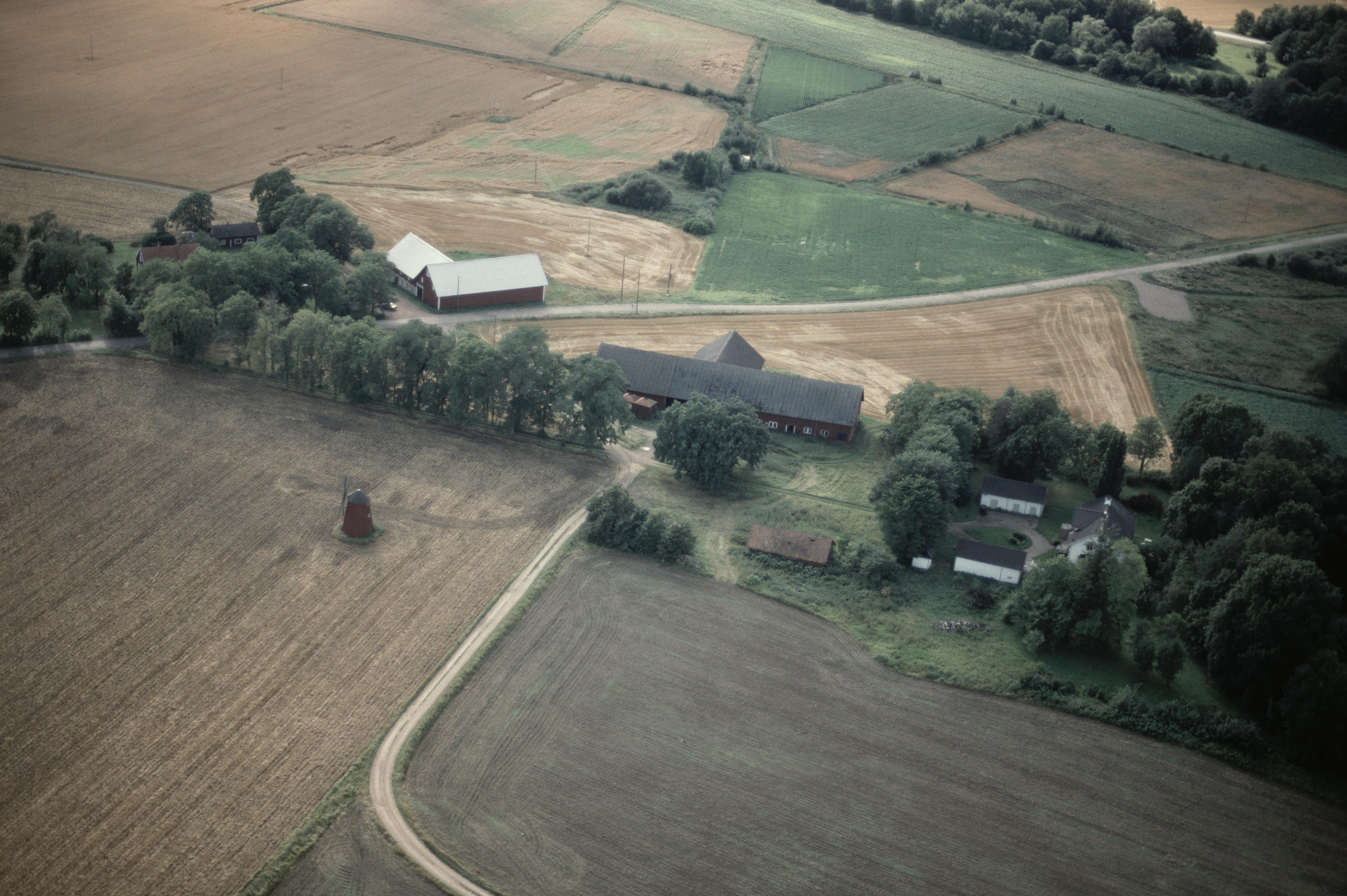 Beskrivning: Stora Broby gård norröst om Alvastra kloster. Boplats RAÄnr Västra Tollstad 22:1 i bildens övre del. Väderkvarn till vänster om bildens mitt. Bilden är tagen mot (väderstreck): SV