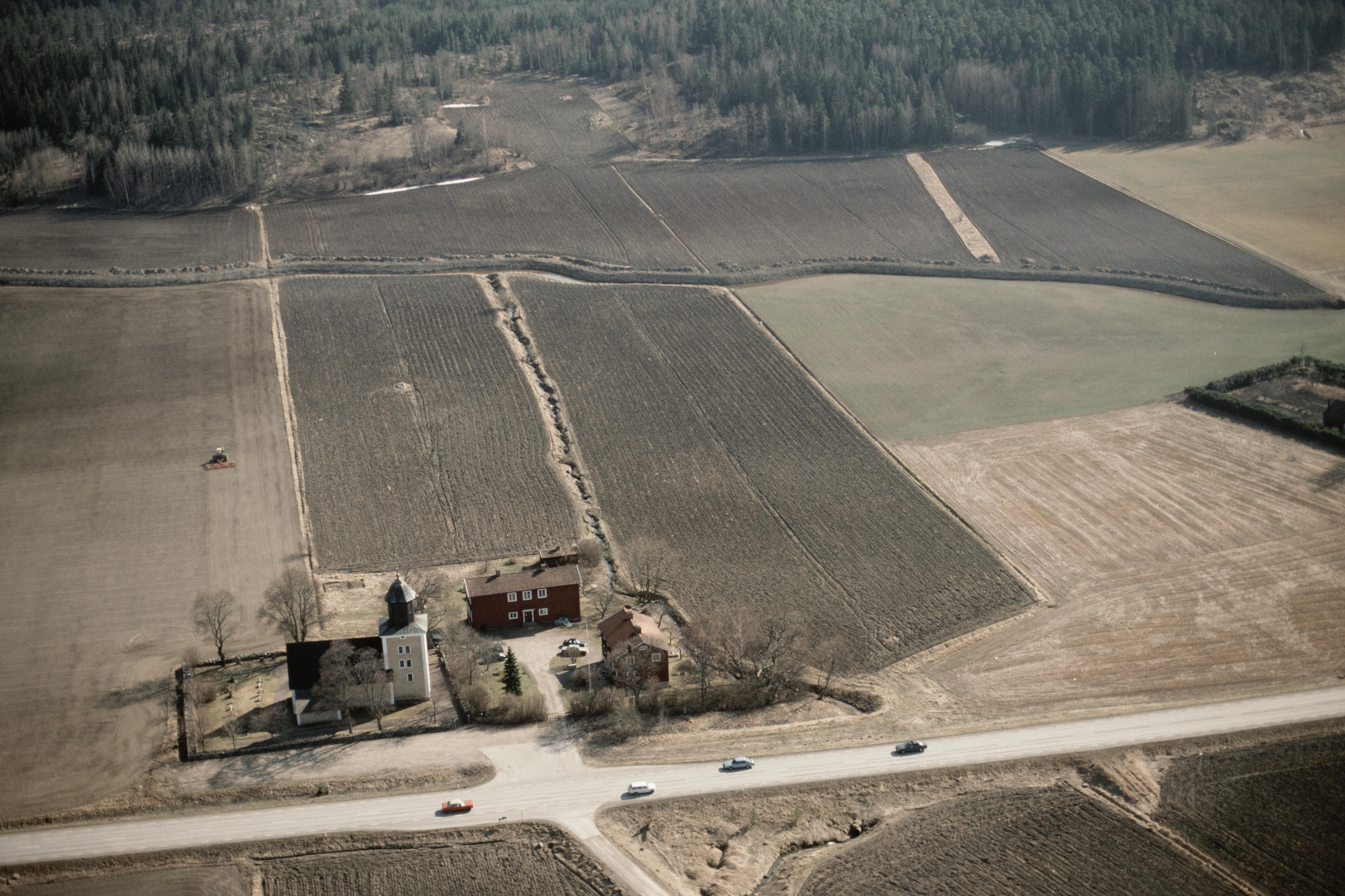 Beskrivning: Hågaåns dalgång vid Läby kyrka och Västerby. Uppe till höger färdväg RAÄnr Läby 20:3. Bilden är tagen mot (väderstreck): N