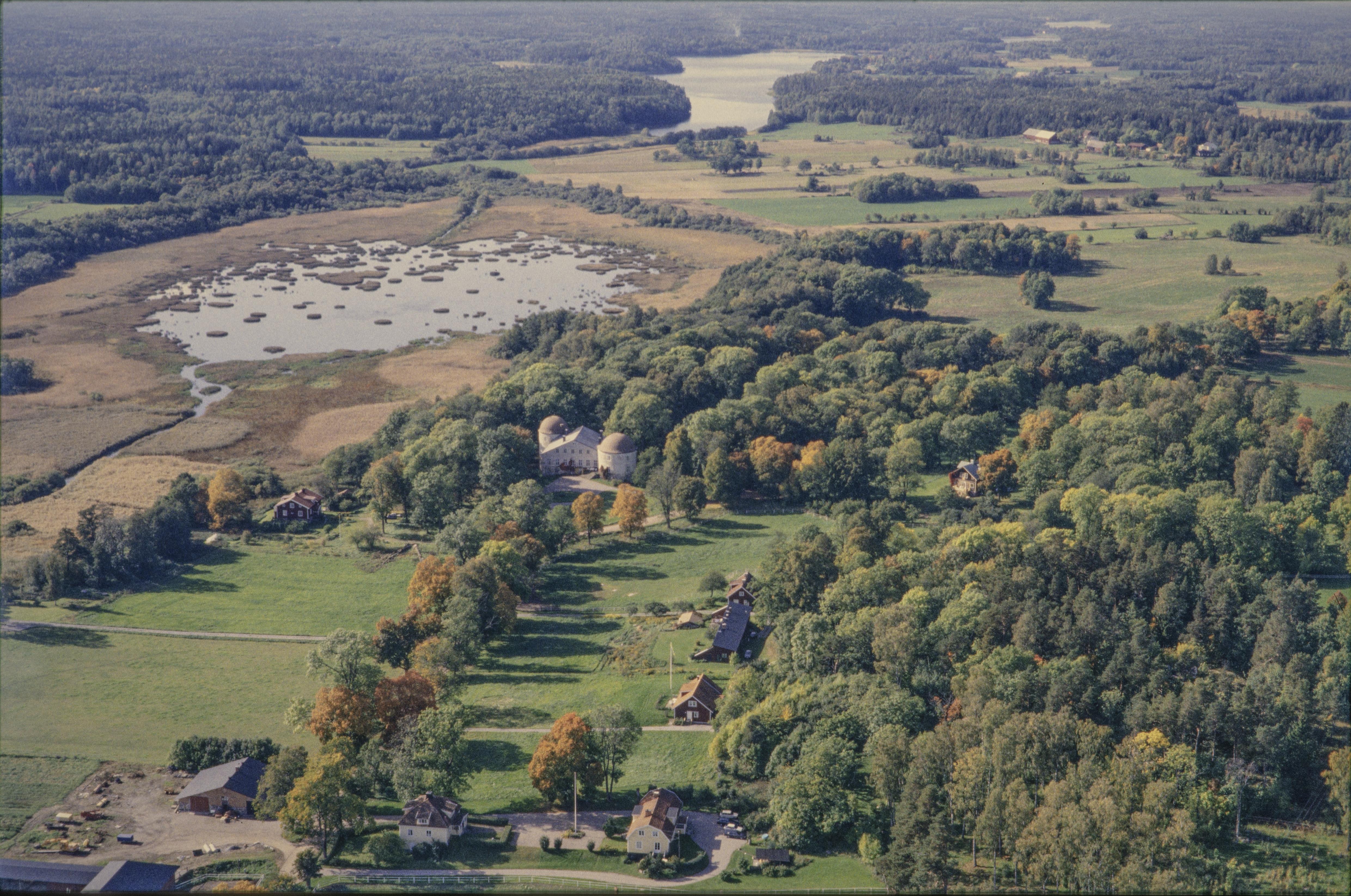 Beskrivning: Penningby slott, byggnadsminne Länna-Penningby 1:4, vid Väsbysjön och gravfält RAÄnr Länna 61:1. I bildens övre del Länna kyrksjö. Bilden är tagen mot (väderstreck): SV
