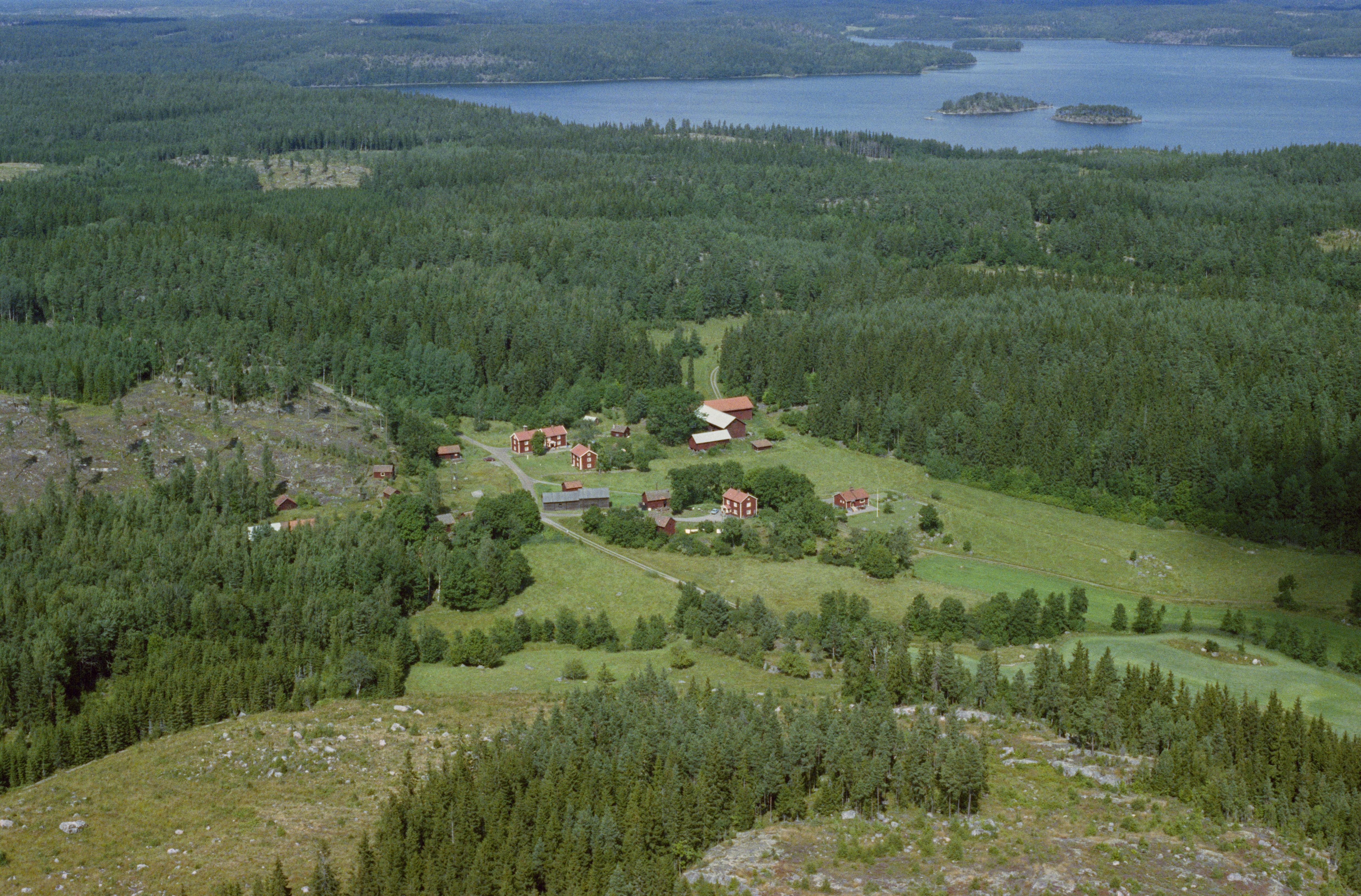 Beskrivning: Långserums by. Logebyggnad RAÄnr Yxnerum 88:1 i byn. Långserums naturreservat vid sjön Yxningen i bildens övre del. Bilden är tagen mot (väderstreck): N