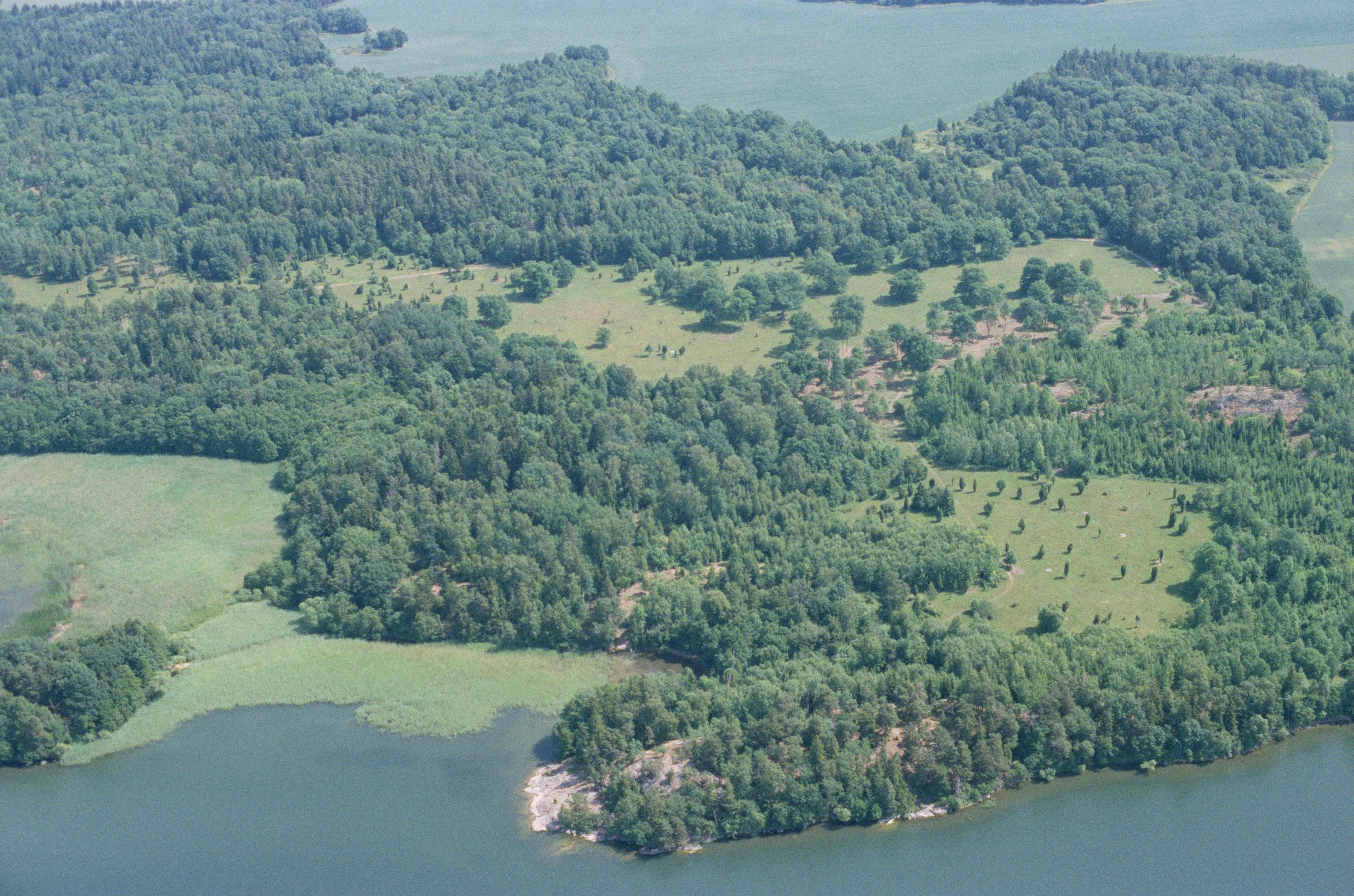 Beskrivning: Munsön vid Svinsundet i Mälaren. I bildens nedre del naturreservatet Väsby hage. Vid bildens mitt fossil åker RAÄnr Munsö 30:1. Bilden är tagen mot (väderstreck): Ö