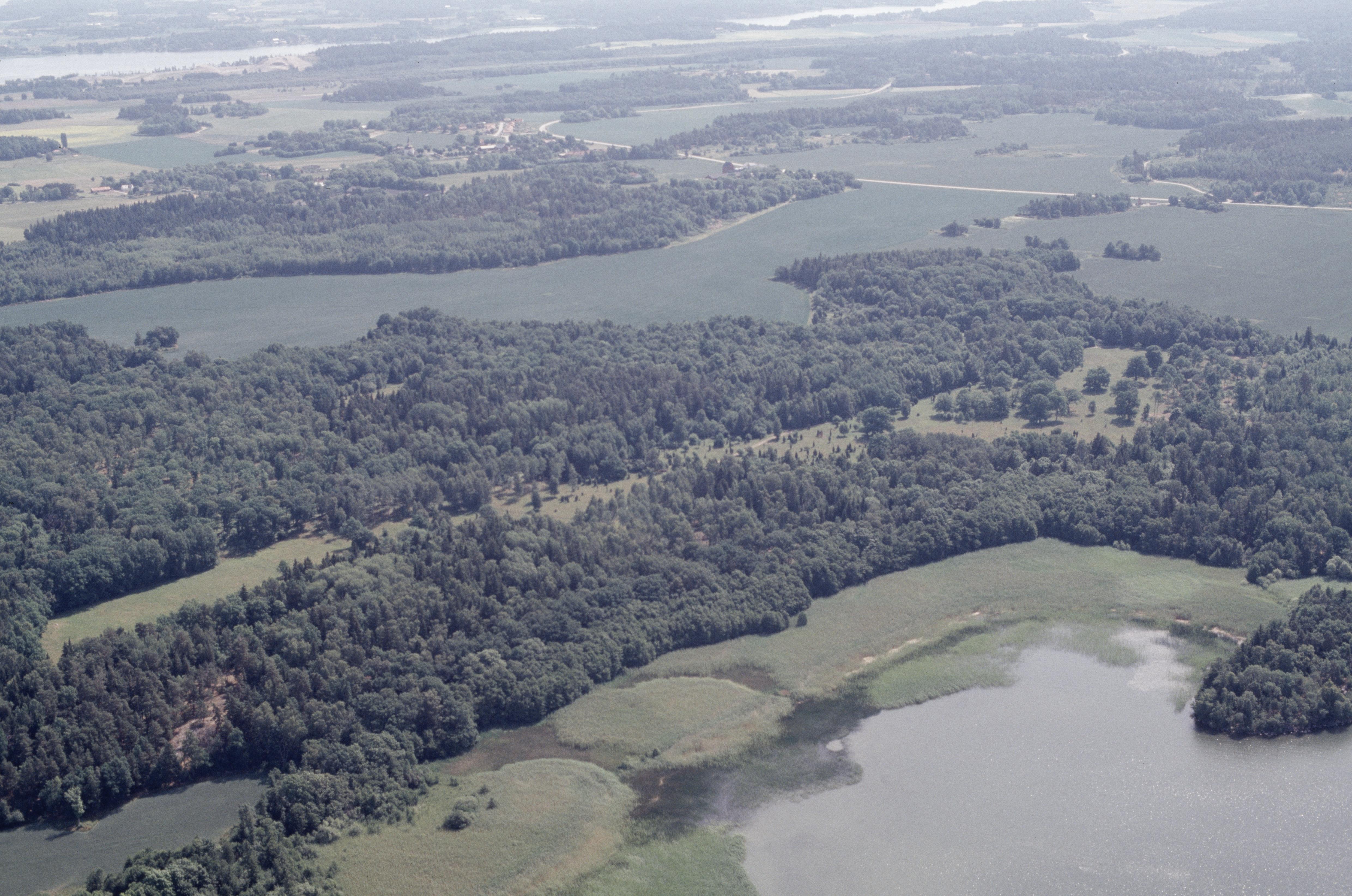 Beskrivning: Munsön vid Svinsundet i Mälaren. I bildens nedre del naturreservatet Väsby hage. Vid bildens mitt fossil åker RAÄnr Munsö 30:1. Bilden är tagen mot (väderstreck): OSO