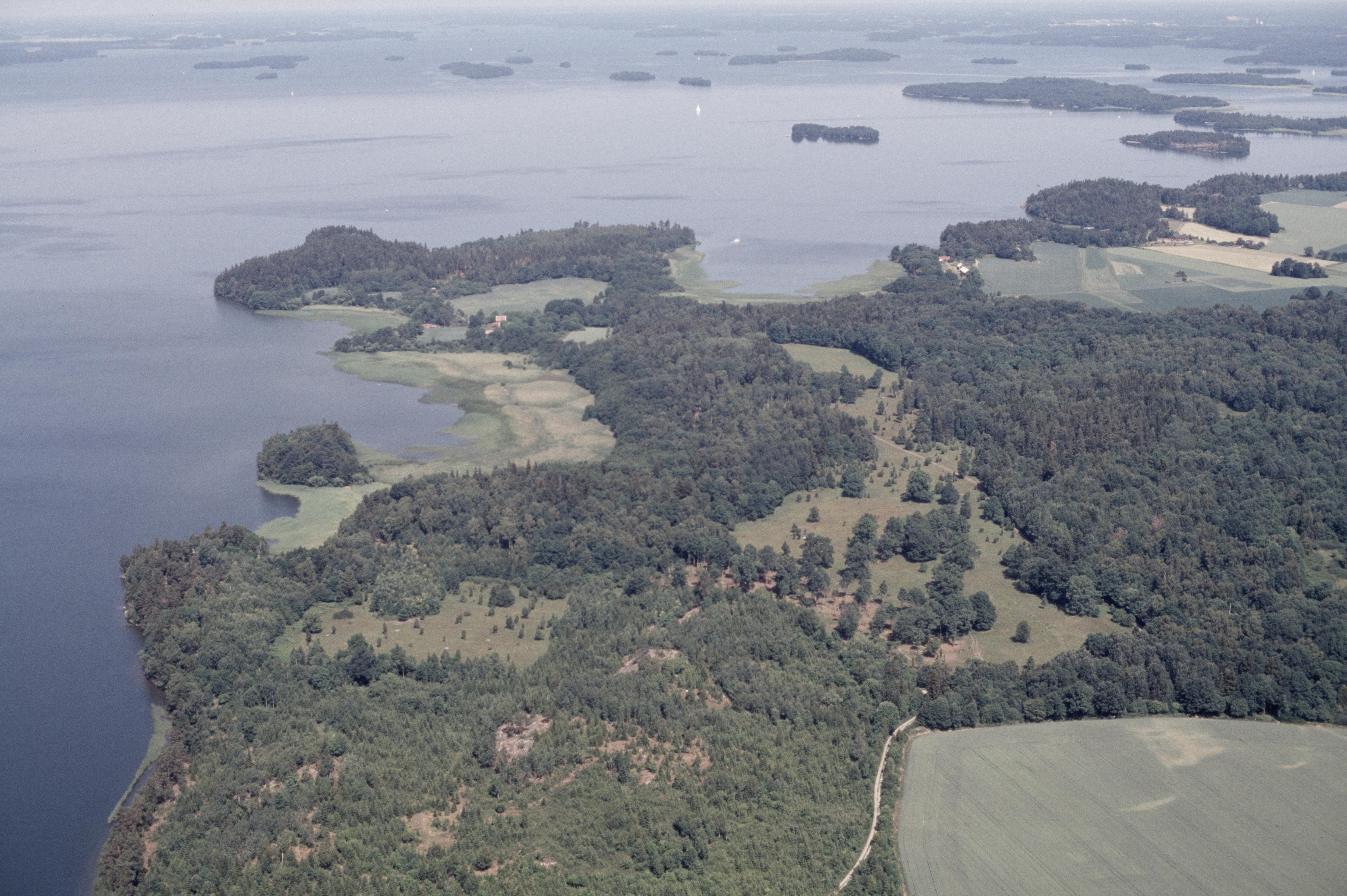 Beskrivning: Munsön vid Svinsundet i Mälaren. I bildens vänstra del naturreservatet Väsby hage. Vid bildens mitt fossil åker RAÄnr Munsö 30:1. Bilden är tagen mot (väderstreck): N