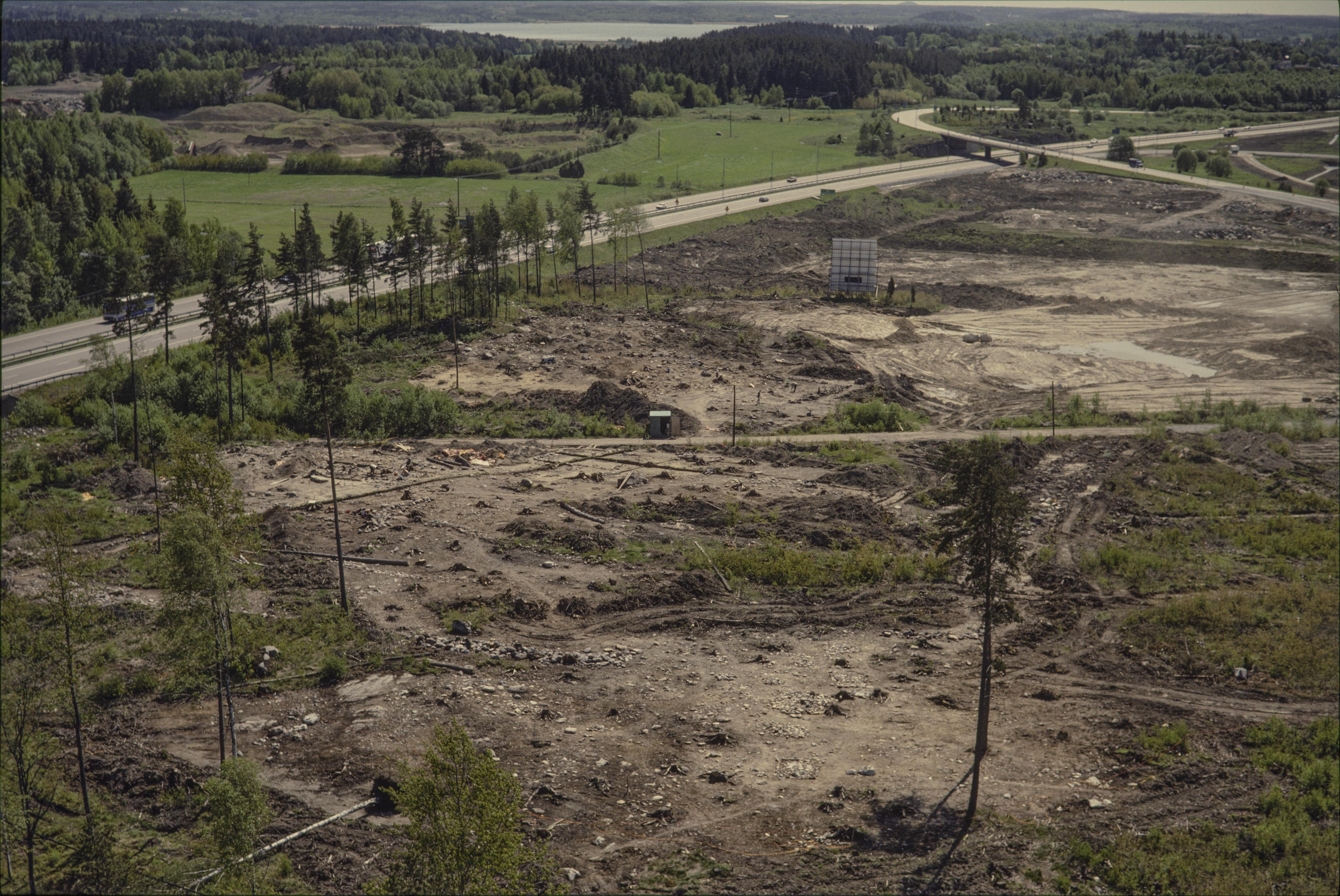 Beskrivning: Arkeologisk undersökning av boplats / hägnad RAÄnr Norrsunda 128:1, 242, 126:1, 129:1, 131:1, 140:1, 235 m.fl. innan bygge av Arlandastad söder om trafikplats Arlanda. I bildens övre kant sjön Fysingen. Bilden är tagen mot (väderstreck): SO