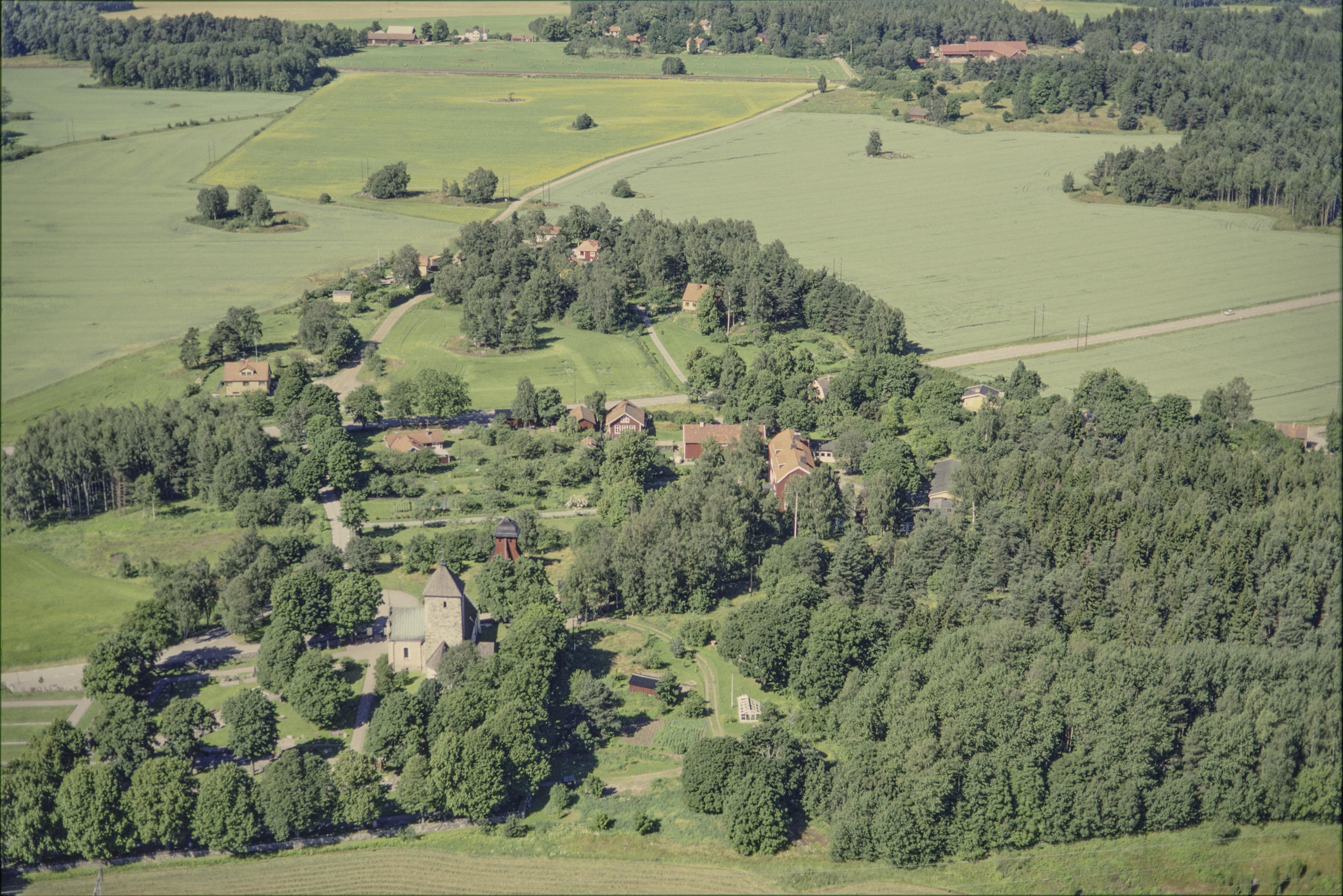 Beskrivning: Norrsunda kyrka och kyrkby. I bildens övre del gravfält RAÄnr Norrsunda 25:1. Bilden är tagen mot (väderstreck): V