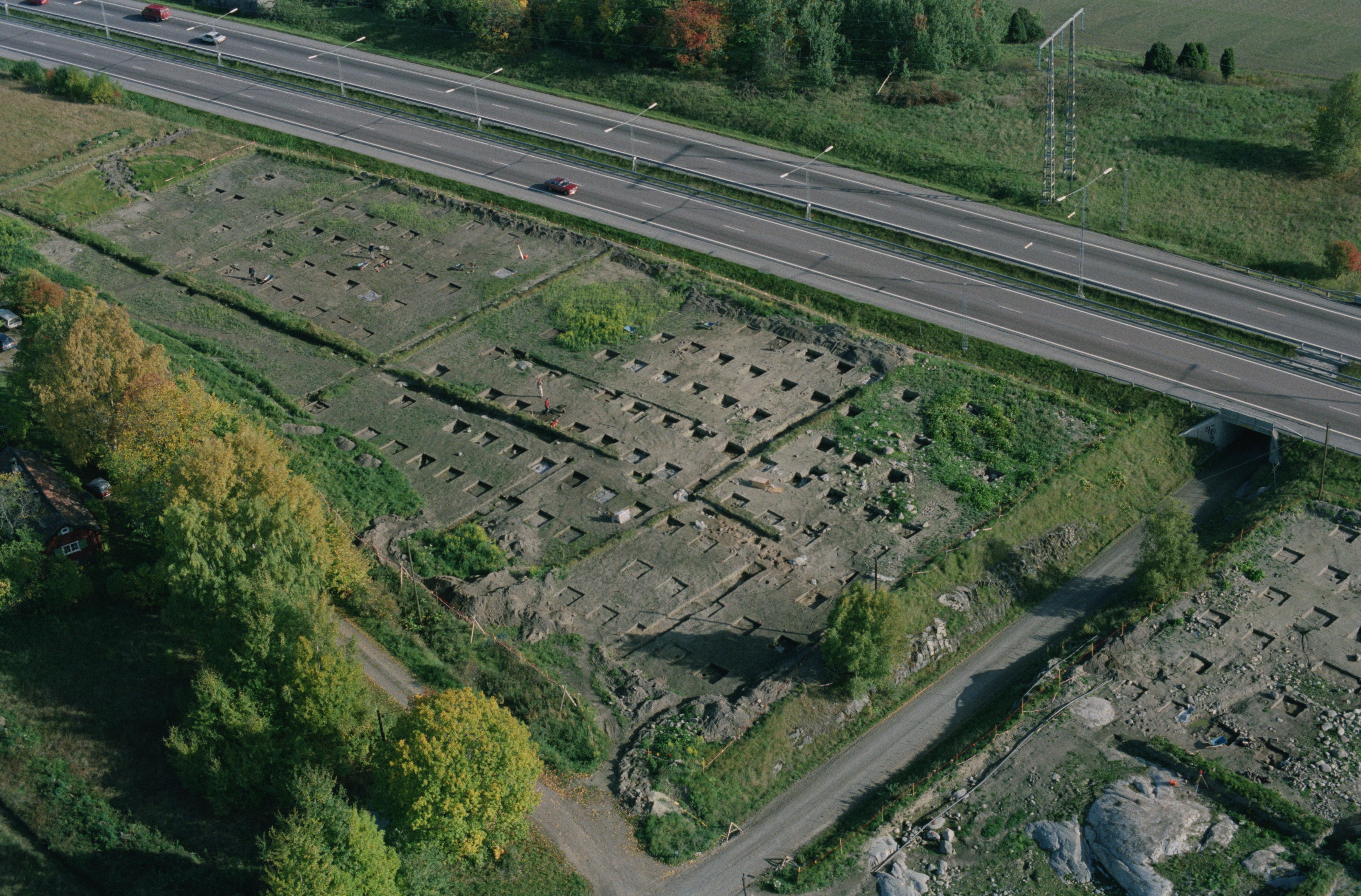 Beskrivning: Anmärkning (övrig): Riksintresse-nr/namn: AB71b - Skålhamravägen. Socken: delen i Skånela och Norrsunda socknar. Motivering: Centralbygd, herrgårdslandskap och vägsystem, med rötter i en forntida stormannabygd med anknytning till kungamakten. Landskapet speglar en rik och komplex järnåldersbygd och dess fortsatta utveckling genom den tidiga medeltidens sockenbildning och 1600-talets säterier, med kontinuitet fram i dagens agrarlandskap. (Fornlämningsmiljö). - Uttryck för riksintresset: Rika järnålderslämningar i form av bl.a. äldre vägsträckningar, många runristningar, flera i urprungligt läge, stensträngssystem och gravfält i anslutning till byar och gårdar. Uttryck för ett kungligt inflytande, som Nordians h(…) Texten i detta fält har förkortats vid migrering till e-arkivet. Se filbilagan extra.xml för fullständig information under note_archivist. Beskrivning: Östra delen av Rosersberg, väster om Ström. Arkeologisk undersökning av gravfält Norrsunda 52:1 innan bygge av järnväg (Arlandabanan). Bilden är tagen mot (väderstreck): ONO Fotosyfte: Flygbildsdokumentation