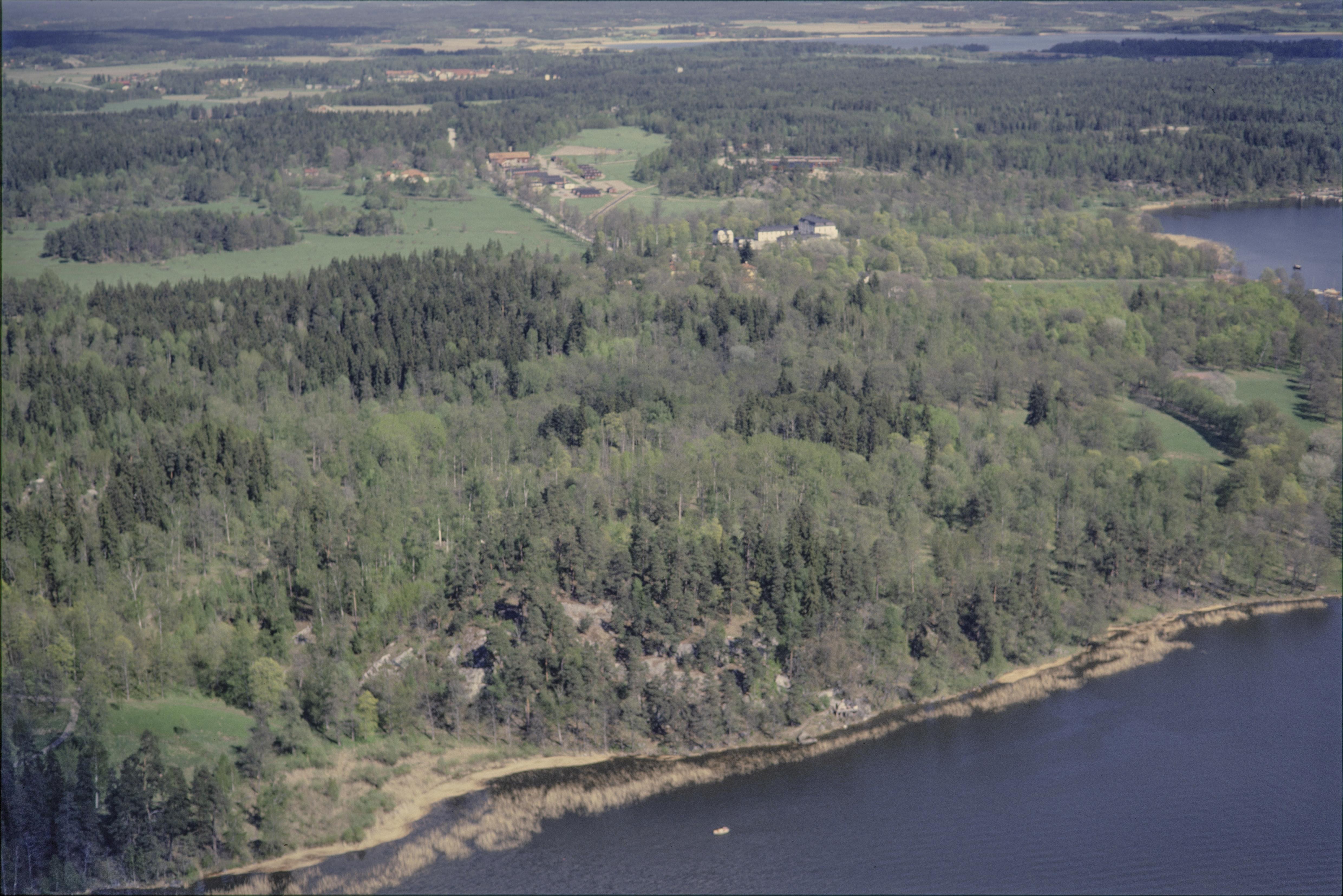 Beskrivning: Fornborg Sandviks skans nordväst om Rosersberg. Uppe till höger Rosersbergs slott statligt byggnadsminne RAÄnr Norrsunda 77:1 vid Rosersbergsviken i Mälarens fjärd Skarven. Bilden är tagen mot (väderstreck): SO