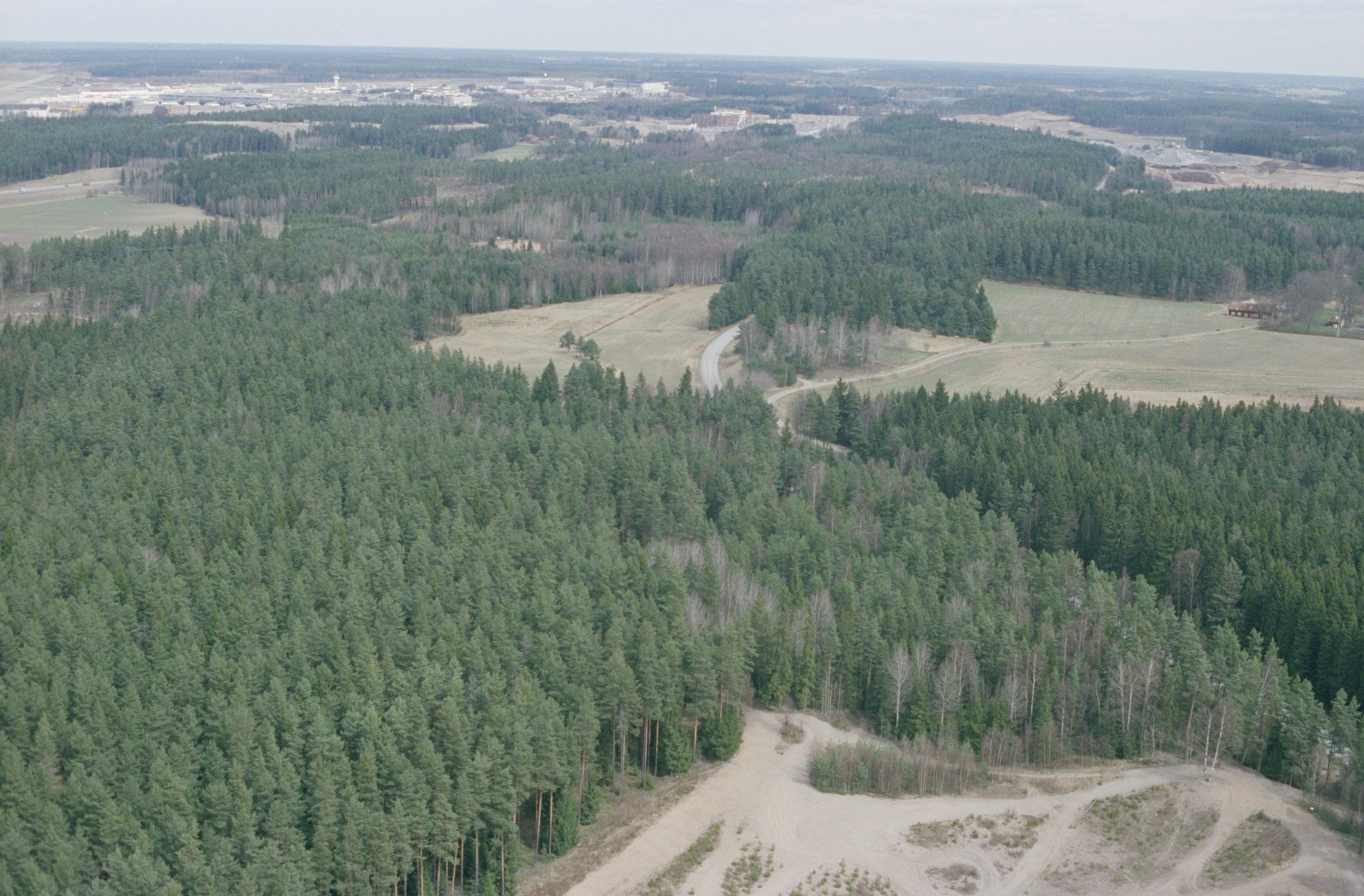 Beskrivning: Området Brotorp, Starrmossen och Blackvreten innan bygge av parkeringsplats och järnvägen Arlandabanan. Färdväg RAÄnr Norrsunda 243 och boplats Norrsunda 209:1 över bildens mitt. Uppe till vänster Stockholms flygplats / Stockholm Arlanda Airport i Husby-Ärlinghundra socken. Bilden är tagen mot (väderstreck): N