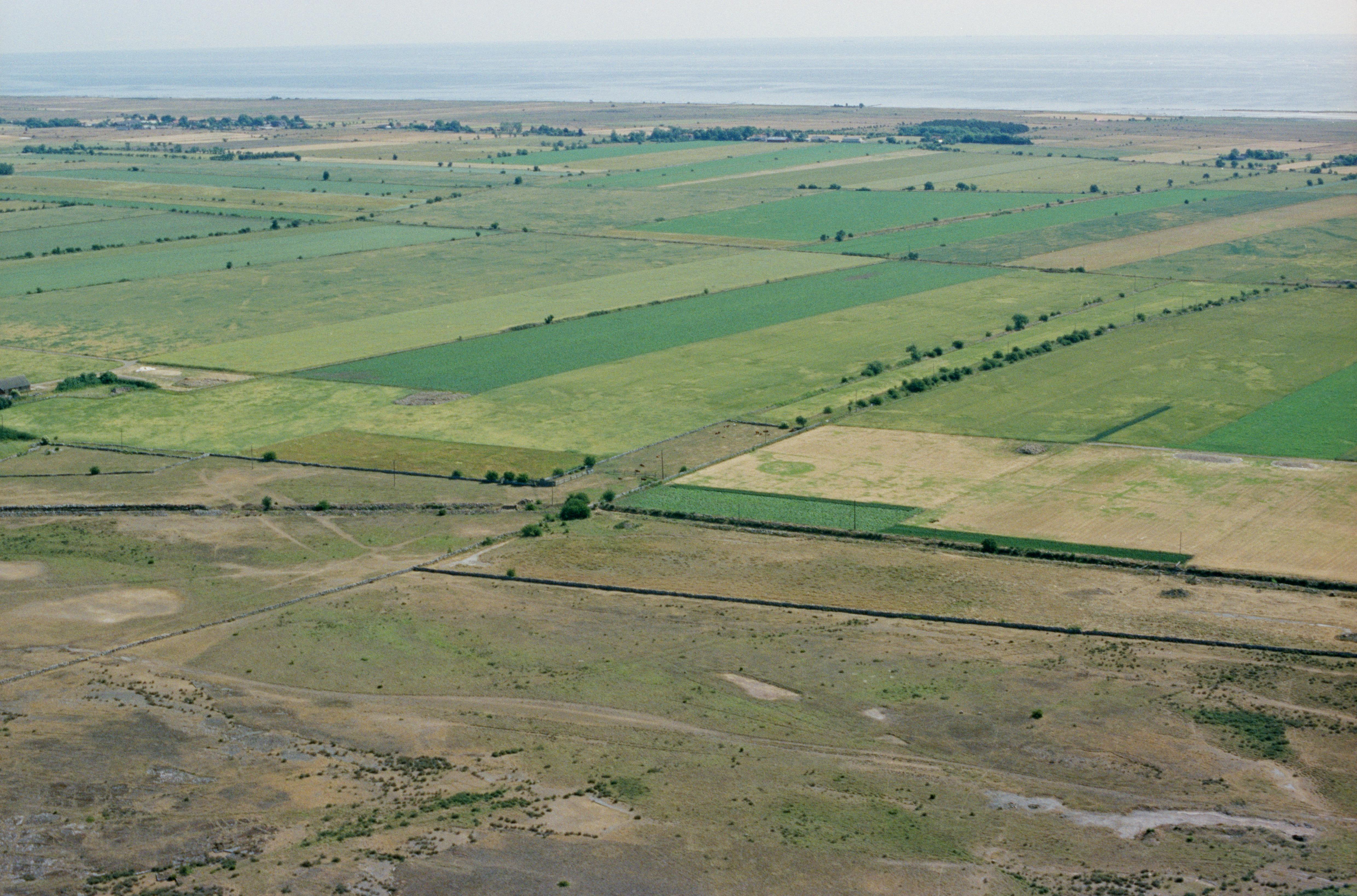 Beskrivning: Alvaret, södra delen vid Kvinnsgröta, Solberga och Mellstaby. Husgrund RAÄnr Gräsgård 119:1-3 i Lötgatan samt spår efter igenlagd gödselbrunn vid bildens mitt. Bilden är tagen mot (väderstreck): Ö