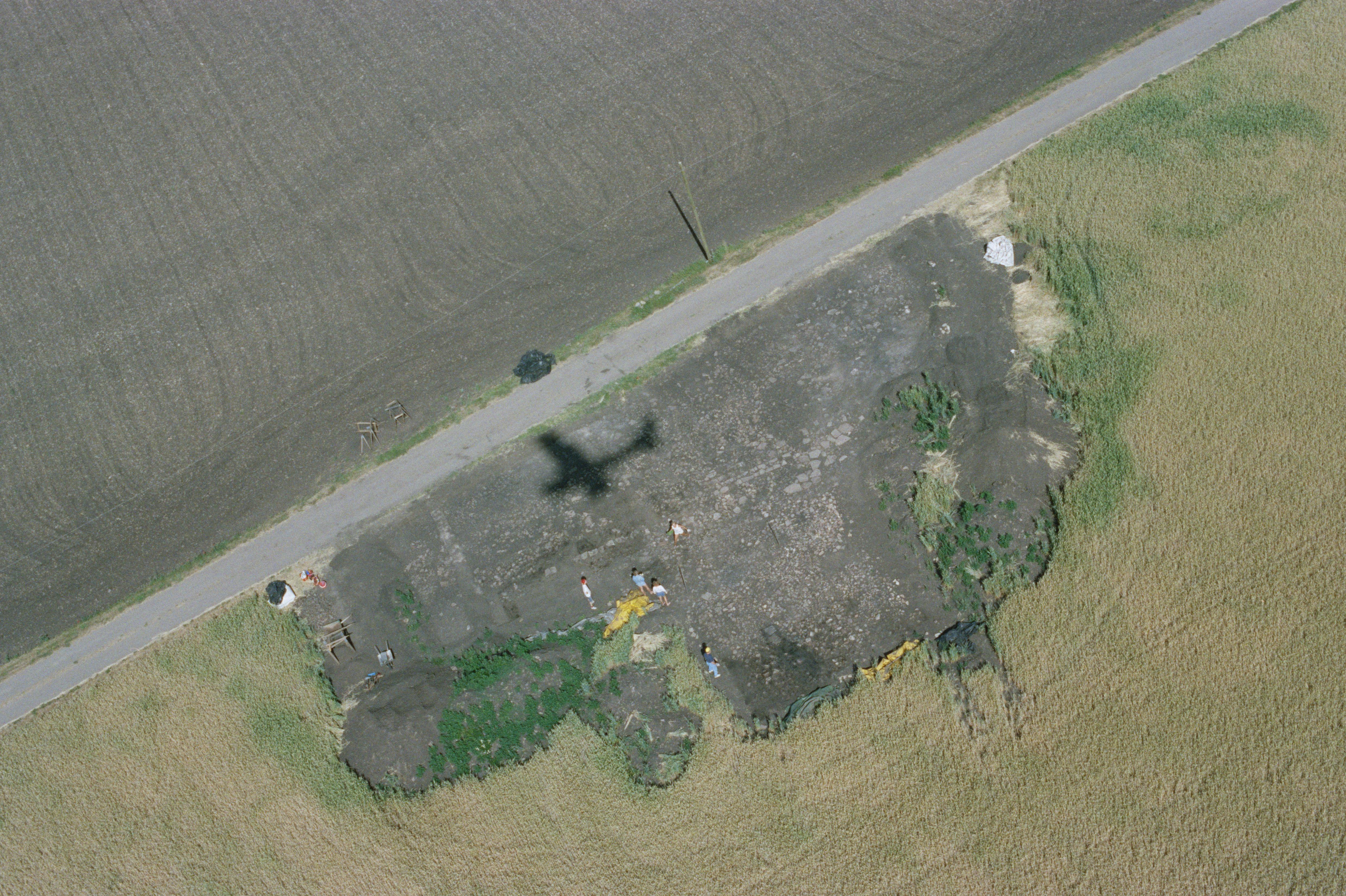Beskrivning: Alvaret, södra delen vid Solberga, Kvinnsgröta, Löt och Mellstaby. Arkeologisk undersökning av boplats RAÄnr Gräsgård 81:1. (NB! Flygplanets skugga i bild.) Bilden är tagen mot (väderstreck): NV