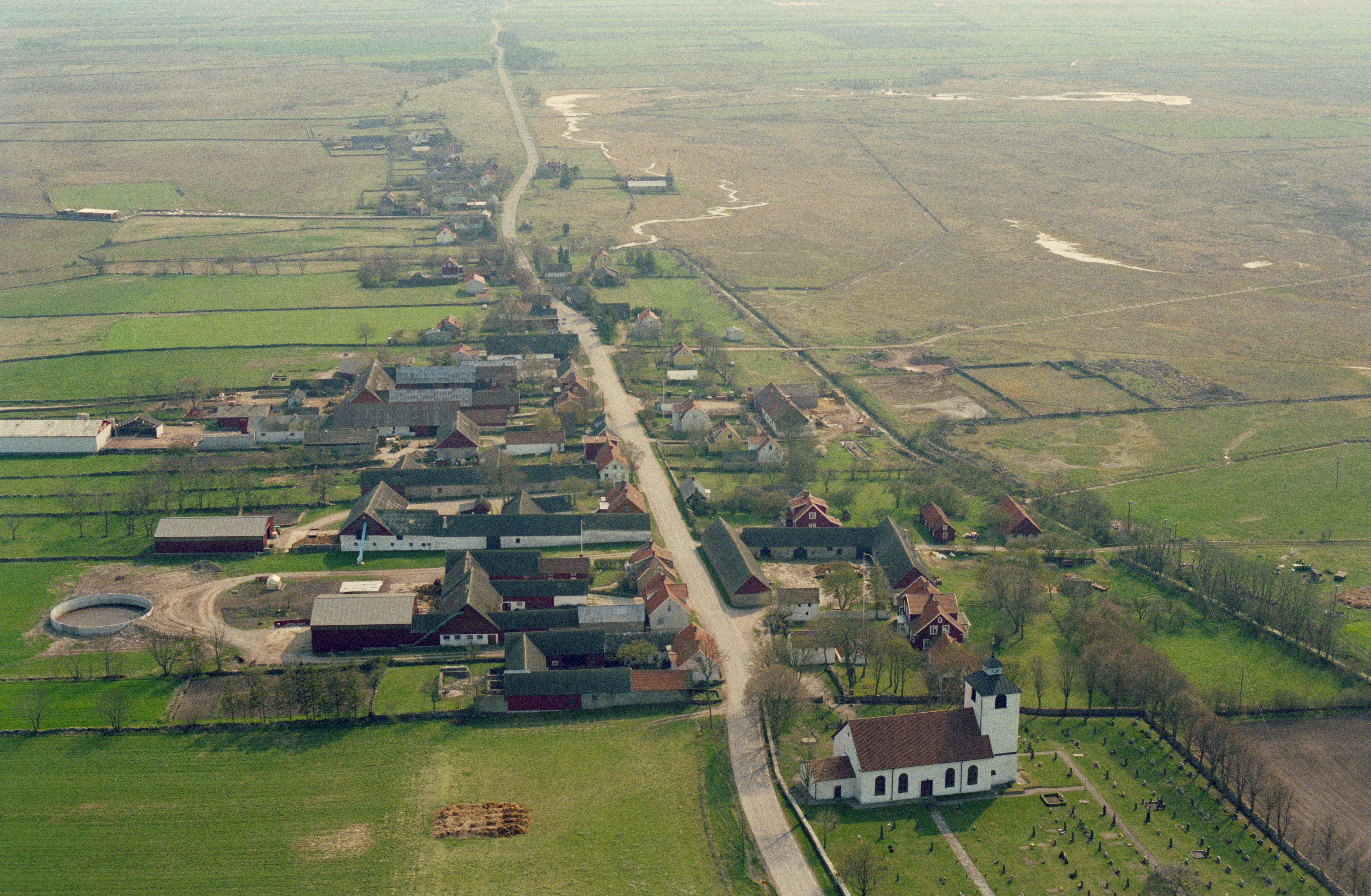 Beskrivning: Alvaret. Hulterstads kyrka och kyrkby. Bilden är tagen mot (väderstreck): S