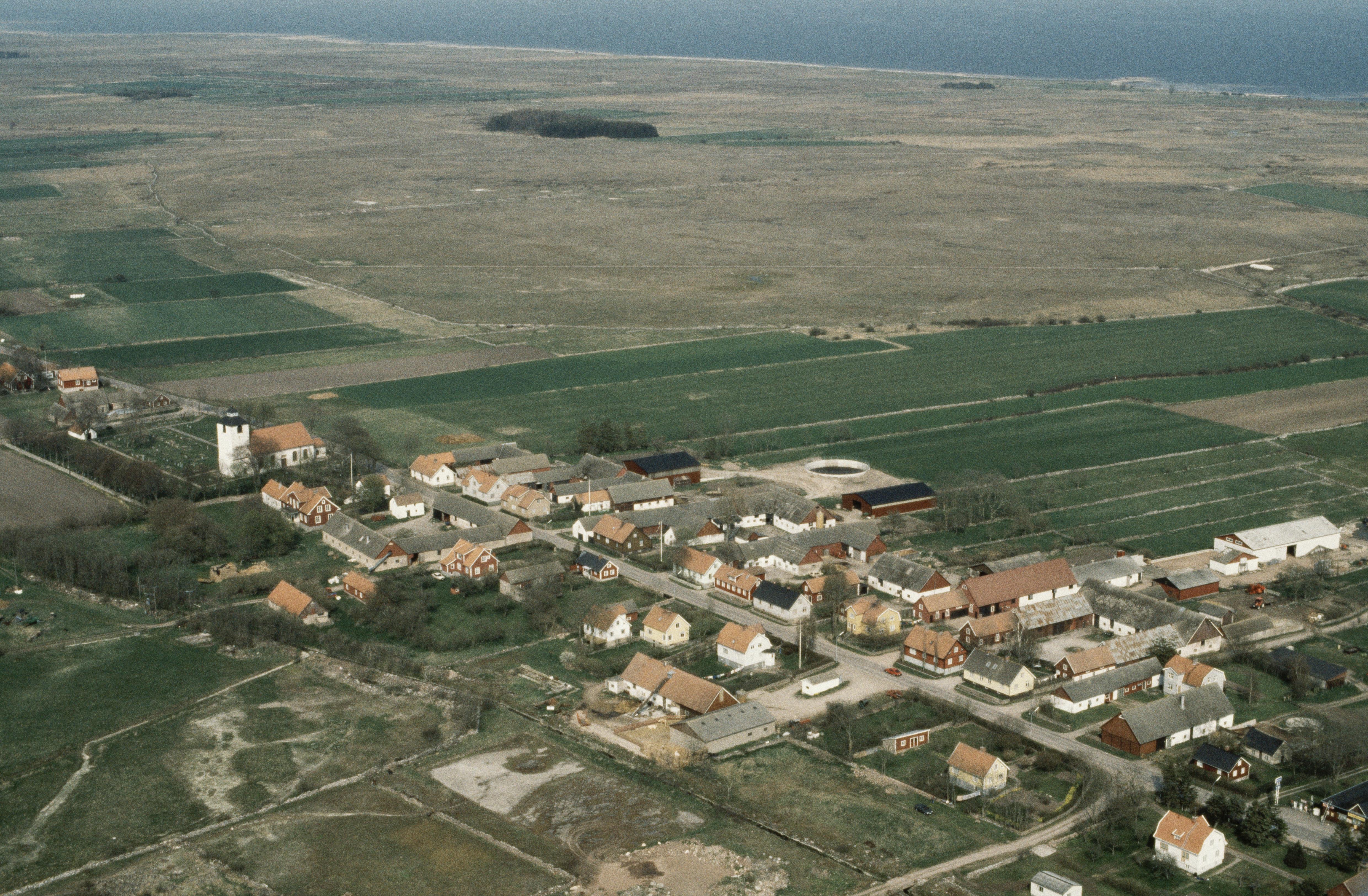 Beskrivning: Alvaret. Hulterstads kyrka och kyrkby. Bilden är tagen mot (väderstreck): NO