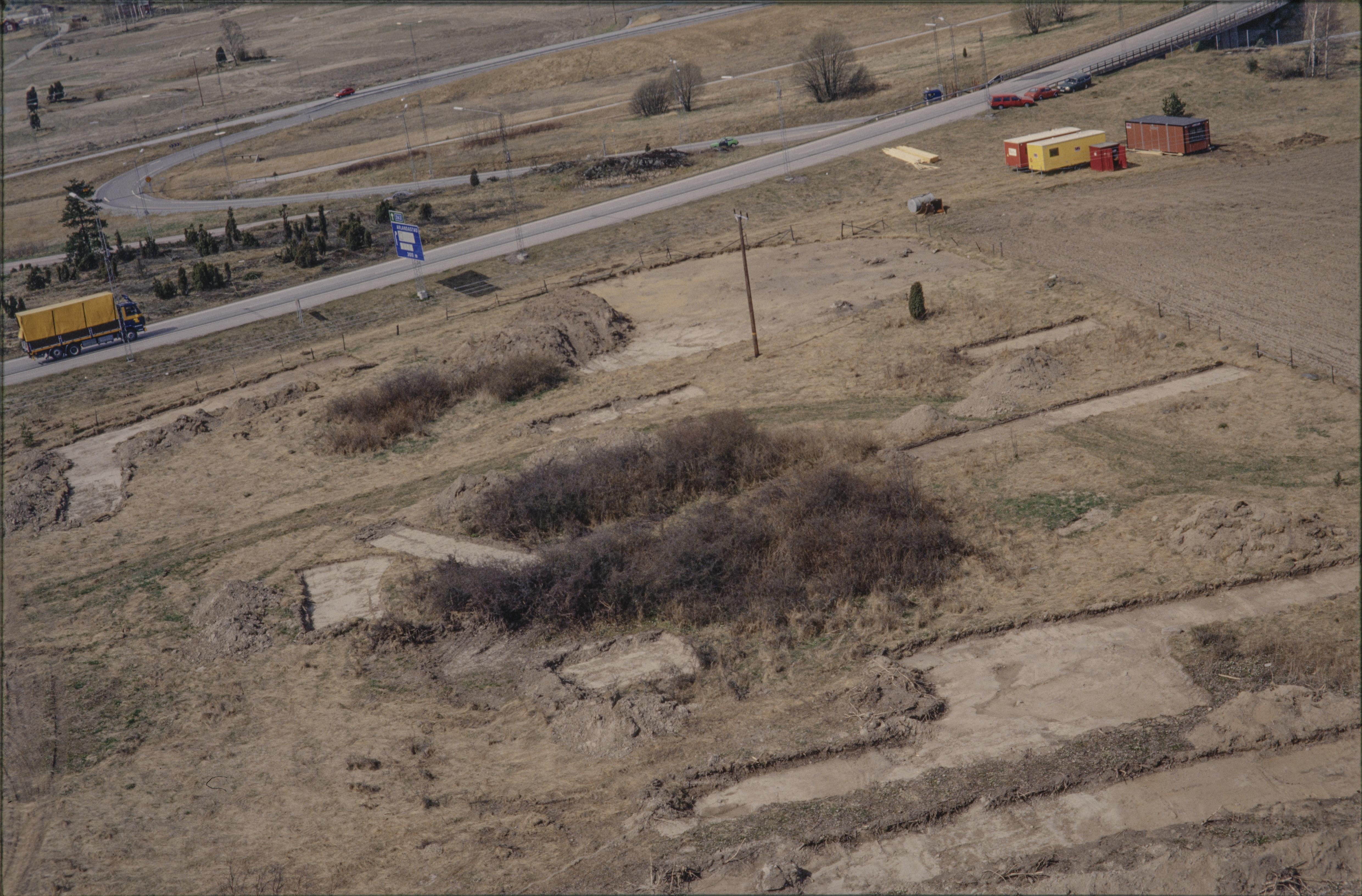Beskrivning: Arkeologisk undersökning på östsidan av Norslunda golfbana och Märsta trafikplats, innan bygge av järnväg (Arlandabanan). I bildens nedre del boplats RAÄnr Norrsunda 185:1-2 och 186:1, färdväg Norrsunda 133:1, gravfält Norrsunda 30:1 m.fl. Bilden är tagen mot (väderstreck): NV