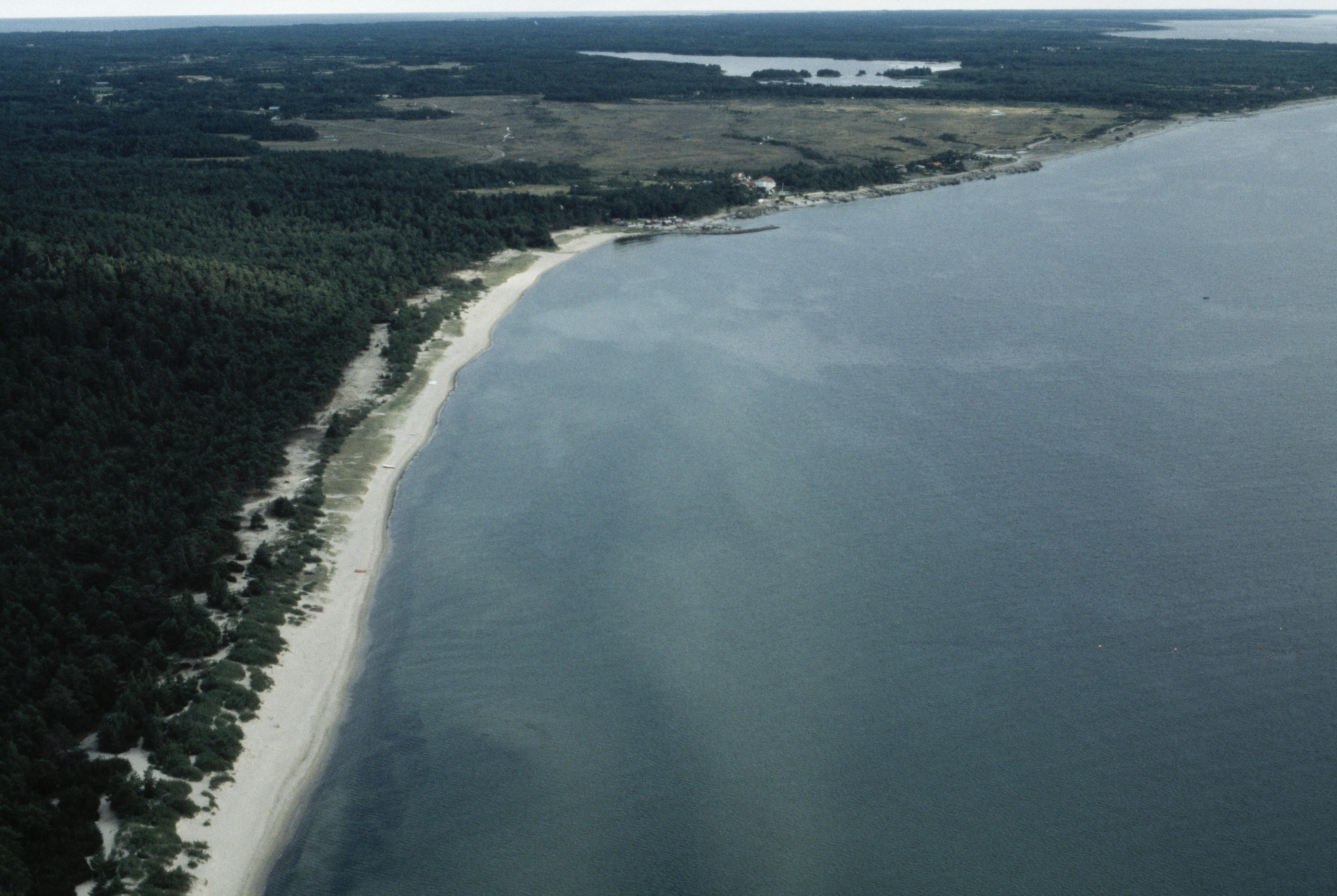 Beskrivning: Ölands västra strand vid Byrum, vid gränsen mellan socknen Böda och Högby. I bildens övre del Mensalvret och Hornssjön / Hornsviken i Högby socken. Bilden är tagen mot (väderstreck): SSO