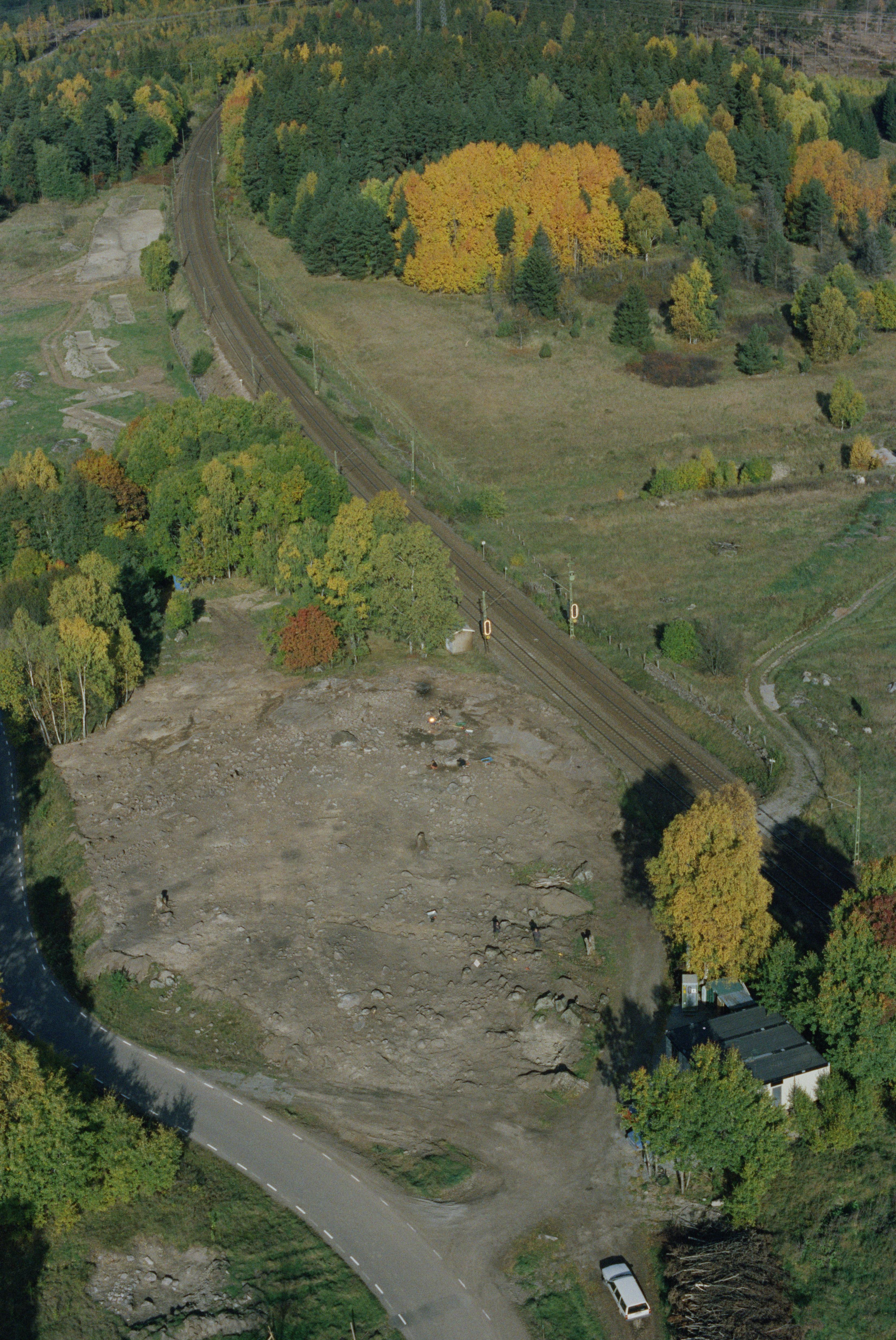 Beskrivning: Arkeologisk undersökning vid Forsby i Forsbyåns dalgång. Husgrund RAÄnr Knivsta 176:1-2 och stensättning Knivsta 189:1. Över bildens mitt gravfält RAÄnr Knivsta 126:1 med hällristningar Knivsta 269:1-9 m.fl. vid Grindstugan. Bilden är tagen mot (väderstreck): NNV